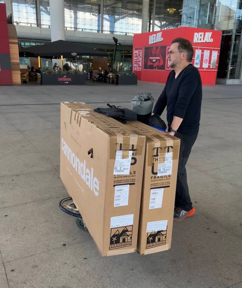 Niet getreurd, fysiek inchecken kan even verderop bij de speciale balie voor reizigers ‘met een probleem’. Na een halfuur wachten en het neertellen van maar liefst €110 rollen er twee strookjes boardingpass uit de printer en kunnen we de fietsdozen eindelijk op de band voor odd size luggage leggen en zelf naar de security check lopen. De schoenen moeten uit van een meneer, en even later toch aan van een mevrouw voor we door het detectiepoortje lopen. Roelie wordt gefoeuilleerd en later ook nog eens gevraagd te blijven, omdat er iets in haar bagage zit dat om nadere controle vraagt. Geen idee wat dat kan zijn, waarschijnlijk het zakje met kaasblokjes. De controleur ziet iets wat een zakmes kan zijn en vraagt Roelie het ritsje van de tas te openen. Roelie kan zich voor de kop stoten en wil het zakmes eruit halen. De inmiddels roodaangelopen schreeuwende controleur verordineert Roelie met haar hand uit de tas te blijven, want zij zou hem kunnen aanvallen met het Zwitserse mini-wonder. Nou zeg! Het zakmes verdwijnt in de prullenbak van de bullebak en zo zijn we weer een schadepost rijker. Het feit dat dit ons al twee keer eerder is gebeurd (in Georgië en New Zealand) en Roelie nog eerder eens (in Australië) houden we maar voor ons.