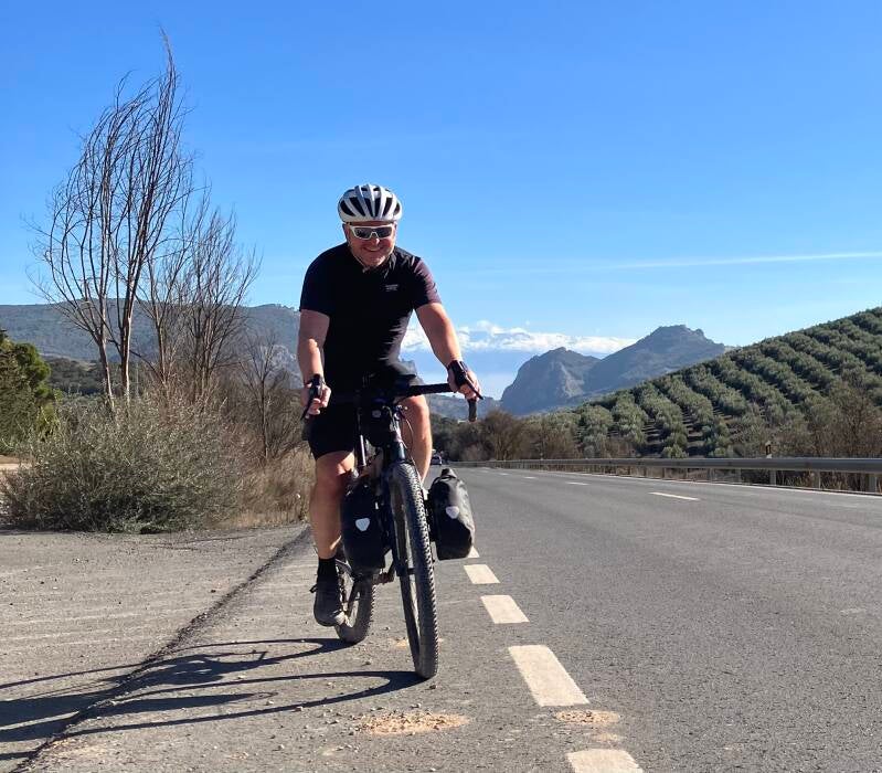 Jaaaa het is vakantie!! Maar waarom gaat de wekker dan op hetzelfde vroege (werk)tijdstip af? Ah ja we gaan naar Andalusië en gaan daar een eindje fietsen. De fietsen, de stalen adventure bikes, nemen we mee want we hopen vooral onverhard te fietsen. Het meenemen van fietsen levert altijd gedoe, spanning en wat stress op, ook nu weer. Als Roelie zich bij het fruit snijden zich een flinke jaap in haar wijsvinger toedient, hopen we nog dat het daarbij blijft en de rest van de reis op rolletjes gaat.