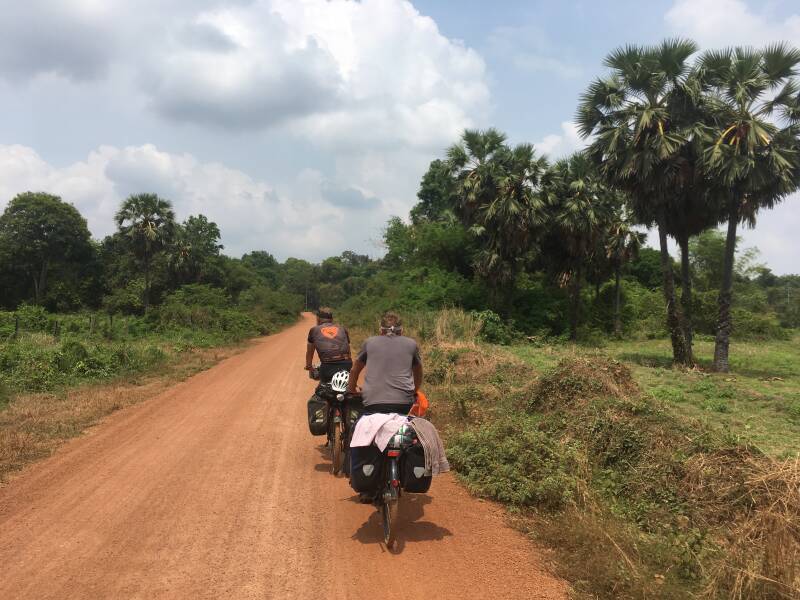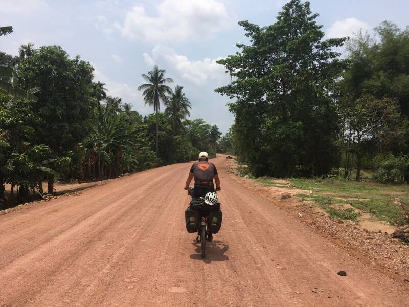 Van Preah Vihear naar Siem Raep zijn nog twee etappes, ene van 55 kilometer naar een dorpje bij tempel Koh Ker en ene van 112. Bij de tweede etappe nemen we een afkorting en slaan af van de hoofdweg, wat de dagafstand zou terug brengen tot 98 kilometer. De eerste vijf kilometer van die afkorting zijn lekker te fietsen: het rode gravelweggetje door dorpjes en jungle is leuk en mooi en de mensen langs het pad zijn vrolijk en blij je voorbij te zien fietsen.