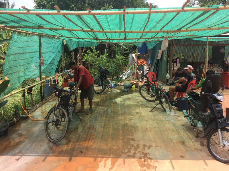 Daarna wordt het pad een singletrack en dáárna een restant van een pad dat tevens functioneert als beekje tijdens het regenseizoen. Het is niet meer te fietsen en dikke modder hoopt zich op tussen wiel en spatbord. Het is weer eens zo’n afkorting (vaak voorgesteld door fietsroute-apps) die we na een tijdje vervloeken en waarbij we het uiteindelijk uitschreeuwen het advies nooit meer op te volgen. We lopen na een tijdje met de fiets aan de hand en het achterwiel opgetild. Het pad ligt vol bladeren en we zijn ons bewust van waarschuwingen dat er slangen in kunnen zitten. Overigens denken we ook aan ander ongedierte terwijl we ons een weg banen door de struiken die over het pad heen groeien. Na op zo’n manier een paar kilometer te hebben voort geploeterd kunnen we gelukkig weer fietsen en als we de bushbush uitkomen is het eerste dat we tegenkomen een scooter-wasplaats. De eigenaar spreekt verrassend een aardig woordje Engels en vertelt dat er best ook wat toeristen op scooters daar de jungle in schieten, maar er vaak al snel weer uit terug keren, meestal wel al onder de modder. Strategisch dus een goede plek voor een wasplaats en heel fijn voor ons om de fietsen én onszelf af te spoelen. De eigenaar vertelt dat we ons (hier) geen zorgen hoefden te maken over de slangen. Ze zijn er wel, maar ze zijn klein en niet giftig. Waar het gebied meer bekend om staat en waar we ons terdege van bewust hadden moeten zijn, is dat er nog heel veel mijnen liggen… okay…!
