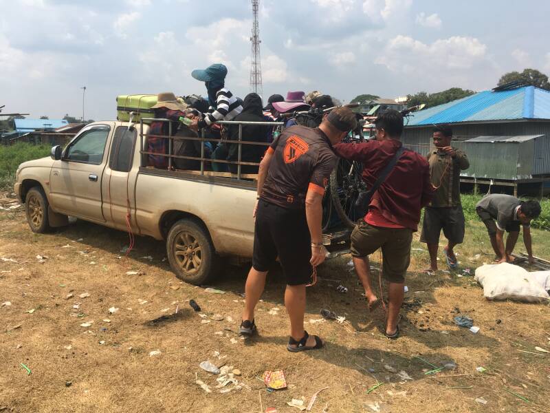 Na drie uur varen legt de schipper aan en vertelt dat we 30 minuten aan wal gaan voor een pauze. Na 30 minuten vertelt de schipper dat hij een bus heeft gebeld. Het water staat te laag en hij vaart niet verder. Onze route apps vertellen dat het nog 46 kilometer is naar Battambang en op het heetst van de dag vinden we dat best wel ver. We hebben gehoord dat het een ‘bumpy road’ is. We zijn benieuwd of de fietsen mee kunnen op de bus. De schipper zegt dat het kan en dat het allerlaatste stuk van de resterende afstand te fietsen is, als we dat willen. Hmmm we gaan graag met de bus mee. De bus blijkt een oude Toyota hillux pickup. De laadklep wordt fietsdrager voor één fiets en met plakken en touwen wordt de andere fiets vastgesnoerd, hangend in het luchtledige. Aan drie zijden worden in de bak balken vastgesnoerd waarop de volwassenen moeten gaan zitten. De kinderen proberen bovenop de bagage (waaronder onze fietstassen) in het midden hun evenwicht te behouden. Uiteindelijk worden zo een man of twintig in en op de arme Toyota gestouwd, natuurlijk de blanken met de chauffeur in de cabine. Alle blanken? Nee, niet alle. Omdat er te weinig plek is in de cabine bij de bestuurder maar juist ook om de fietsen in de gaten te houden, neemt Roelie plaats tussen de locals achterin. De weg is erg slecht. We vliegen alle kanten op en achterin duiken we de bak in om takken te ontwijken. Met leden ogen ziet Roelie hoe voeten op de fietstassen staan terwijl we massaal op en neer stuiteren. In ene zit een laptop. De balk schuift langzaamaan tussen de spaken van Harry’s fiets en als die ook mee stuitert en het Roelie niet lukt tijdens de stuitingen het wiel voldoende weg te drukken, laat ze de pickup stoppen. De chauffeur legt nog eens een extra touw aan en zegt dat het nu okay is. We gaan weer verder, maar het gaat niet goed. Het is wachten totdat er spaken knappen en wie weet welke ander schade nog meer wordt aangericht die vanuit de plek waar Roelie zit niet is te zien. Ze laat de pickup opnieuw stoppen. De fietsen gaan er af. We gaan fietsen. Het is nog maar een kleine 40 kilometer.