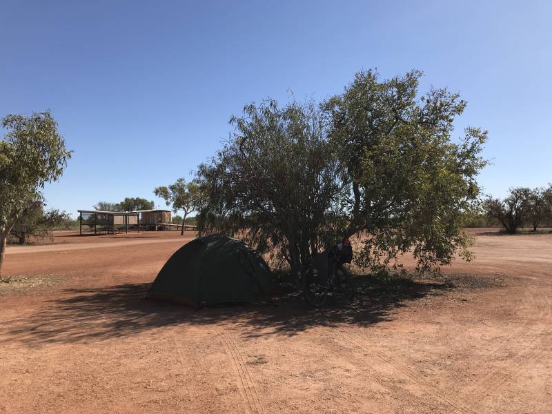 Op overnachtingsplekken zijn er altijd mensen die naar ons toekomen en zeggen: “we zijn jullie vandaag (gisteren, vorige week, enzovoort) gepasseerd!” Nu komt Bob naar ons toe: “you must be the two Dutchies” en hij vertelt dat hij ene Henry heeft ontmoet, die over ons verteld heeft (wij hebben een dag of 10 samen met Henry door The Kimberley op weg naar Broome gefietst). Bob en Henry hebben gisteren samen op een rest area gestaan en niet lang daarna valt bij ons het kwartje dat Bob ook op de fiets is. Wat leuk, weer een fietser en verhalen! Hij vertelt dat hij net als Henry probeert om het rondje Australië vol te maken. Voor hem betekent dat nu van Darwin naar Perth. Tot aan Broome heeft zijn vrouw meegefietst en nu staat hij er alleen voor en dat valt hem wat zwaar. Na enige motivatieproblemen gaat hij morgen weer verder en hij verwacht dat we hem al snel zullen inhalen. Dat gebeurt overigens niet. Wij nemen een dagje rust en blijken de eerste dagen daarna niet alleen exact dezelfde etappes te fietsen, maar ook op exact dezelfde plek de tent neer te zetten.