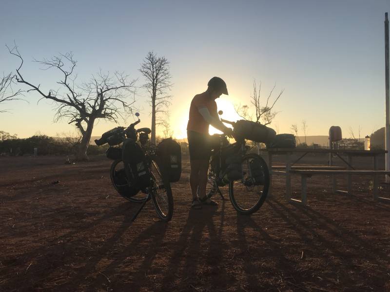 Nog in het donker breken we de volgende ochtend de kletsnatte tent af. Wij gokken dat deze dauw voor heel wat flora en fauna een beetje verlichting brengt in het droge seizoen. Overdag schommelt de luchtvochtigheid tussen de 5 en 10 procent en wordt het heet, vaak boven de 35 graden. ’s Nachts zakt de temperatuur naar iets van 15 graden. Vroeg in de ochtend zijn soms de handen en tenen koud en hangt er een druppel ‘an die naas’. Als we beginnen te fietsen is er eerst meestal maar weinig wind en sinds Broome krijgen we daarna de wind van voren en kunnen we aardig tegen in bikkelen. Na 30 km is het tijd voor “hulkenpoeder”, de toverdrank die we in Broome hebben gekocht. Het is een wit poedertje dat in water groen wordt en het water zoet maakt, ioniseert en de door zweet verloren mineralen aanvult en ons onmenselijke krachten verleent gedurende de consumptie van het goedje.