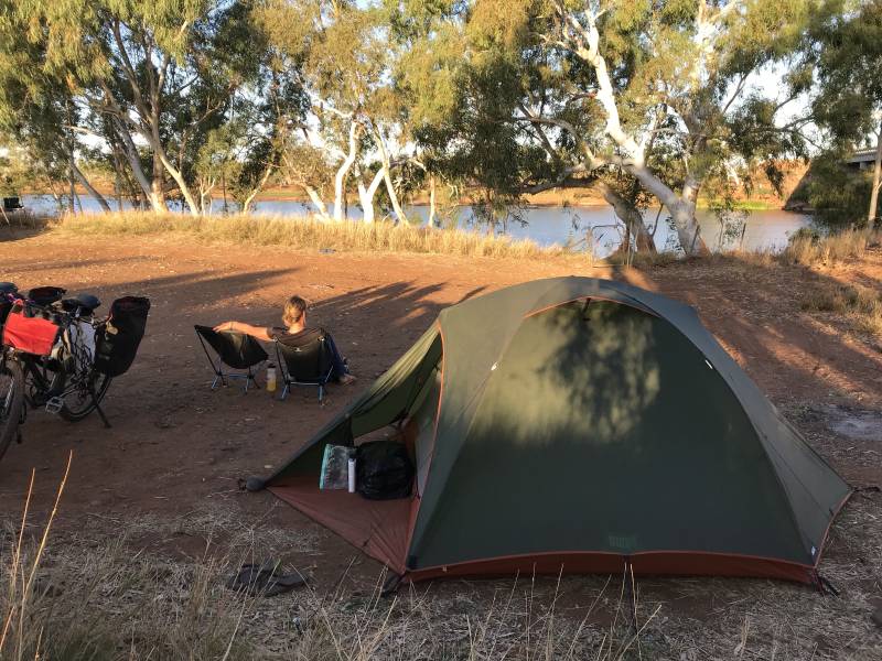 Er volgt een lange wacht totdat we kunnen koken maar dankzij een aantal andere kampeerders hier vliegt de middag om. Eerst babbelen we met Bill. Hij is als Willem geboren in Wassenaar en met zijn ouders via Zuid Afrika in Perth terecht gekomen. Hij is net gestopt met werken en kan nu volop reizen al lijkt het alsof hij nog niet helemaal zijn draai heeft weten te vinden. Ian & Doth lijken daarentegen volledig te zijn ingeburgerd als reizende pensionada’s. Ze wonen in Perth en bieden aan onze waterzakken te vullen en bieden daarbij een koud biertje aan. Eigenlijk is alles wat koud is en drinkbaar is ongelooflijk lekker in de middag, dus ook het biertje na de overdosis van laatst. Het is inmiddels namelijk ook aardig warm aan het worden in Australië en ons drinkwater dus ook. ‘s Avonds koken we een pan romige pasta (deze keer zonder zand) en sturen we Fleur, onze warmshowers host in Broome, een berichtje dat we niets nodig hebben. Fleur rijdt ons namelijk morgen tegemoet na een cursusweek in Port Hedland en als we iets nodig hebben, mogen we dat bij haar bestellen maar dat doen we dus niet. We hebben voldoende voorraden over. Fleur reageert dat ze toch iets gaat meenemen voor ons: “some treats.”
