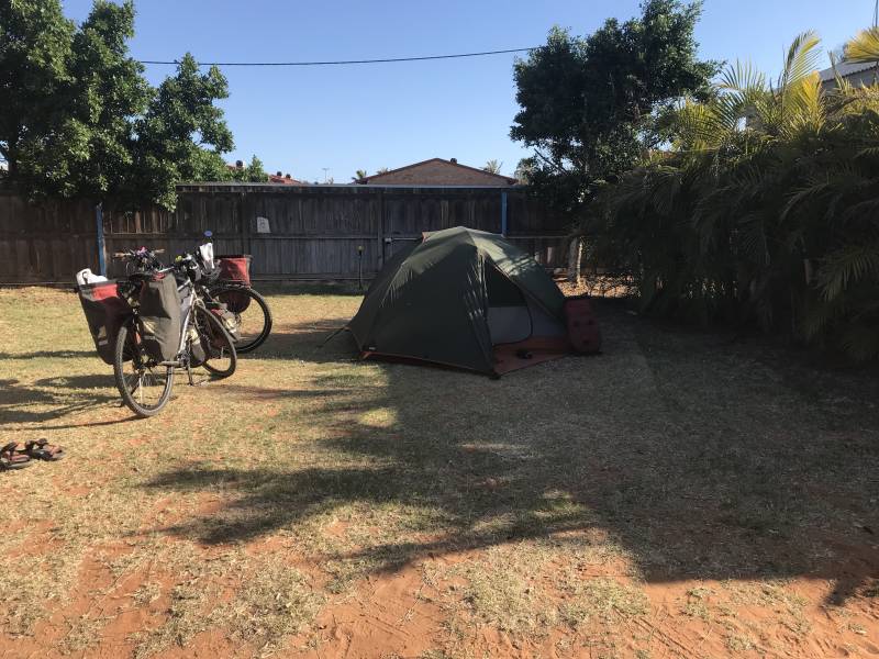 Op ons tandvlees bereiken we de eerste tekenen van beschaving, de Northern Plantations: een tuinbouwgebied met fruit- en groenteteelt: bananen, papaya’s, tomaten, mango’s, noem maar op, het wordt hier geteeld. Het levert een beeld op dat we tot nog toe niet hebben gezien op onze tocht door Australië. Na deze plantages fietsen we het stadje binnen, dat vooral lijkt te bestaan uit Caravan Parks en verder niet zoveel om het lijf heeft. Wij fietsen door tot het laatste en waarschijnlijk beste caravan park, het luxe Coral Coast Tourist Park. Een plekje daar zou ons normaliter een fortuin kosten, maar we mogen er gratis ons tentje opzetten! De eigenaren, Nic en Donna, zijn namelijk lid van het Warmshowers, het wereldwijde netwerk van fietsers die elkaar onderdak geven. Helaas zijn zij zelf op vakantie, zodat we niet kennis kunnen maken met onze weldoeners.