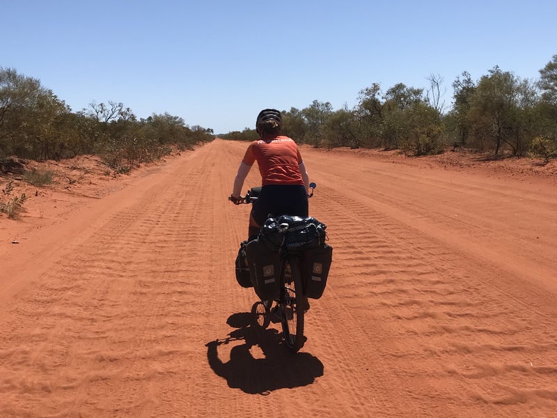 Genietend van de relaxte sfeer, ook wel Broome time genaamd, springen we pas na het middaguur op de fiets en staan we al snel stil langs de kant van de weg. Het trottoir annex fietspad heeft niet zoals in Nederland alle opties van kruispunten. Als we linksaf willen afslaan om Broome te verlaten, ontbreekt die optie en duwen we de fiets van het fietspad naar de weg door het rode zand met bermmaaisel. Wat we dan niet zien, maar even later wel, is dat het bermmaaisel vol zit met doorns en onze banden daardoor een soort tweede huid hebben vergaard. We stoppen om alle doorns uit de banen te peuteren en prikken onszelf veelvuldig in de vingers. Je kan het je niet voorstellen dat de banden niet leeglopen na zoveel terreur. Een half uur later lijken alle doorns uit de banden te zijn verwijderd en fietsen we nog vol ongeloof op nog steeds volle banden dan toch echt Broome uit. Keigoed die schwalbe tires.