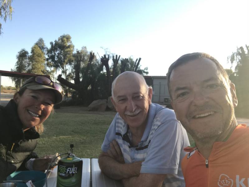 Als we de tent inpakken komt Bob gezellig met ons kletsten. De mensen van een fietsgroepje met begeleiding van een auto wandelen langs om te ontbijten in het restaurant van het roadhouse en maken net als gisteren ook weer een praatje. We vragen degene die vandaag in de volgauto moet rijden om een jerrycan met 10 liter water voor ons op de restarea te zetten en dat is geen probleem en voor ons één zorg minder. Tijdens het ontbijten voegen ook Bruce en Cathy zich erbij. Het is gezellig en we zetten een extra kopje koffie om het vertrek en afscheid nog wat uit te stellen.