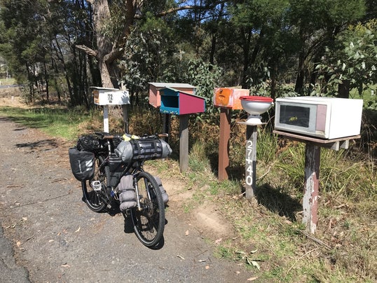 De East Gippsland Rail Trail is een 98 km lang fietspad en we vieren vandaag dat we op dit avontuur de grens passeren van 25.000 kilometer. Onder het mom van “heb plezier met wc papier” leggen we de papieren (of zilveren?) cijfers op de grond en strooien er snel grind over heen voordat ze wegwaaien. Gelukkig hebben we het fietspad voor onszelf en hebben we alle tijd om een selfie met zelfontspanner te maken. Midden op het fietspad stenen stapelen, tripod erop, instellen en (terug)rennen: na een half uur ‘geklooi’ met papier en op-en-neer gesprint, hebben we een bevredigend resultaat.