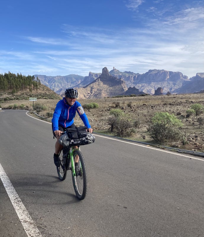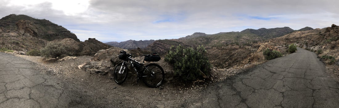 Maar goed, we hebben een andere focus vandaag: met meer dan 3000 hoogtemeters belooft het de zwaarste etappe van onze fietstocht over de Canarische Eilanden te worden. Onderweg komen we slechts één gehucht (El Risco) tegen dat een bar/café zou hebben, maar we durven er niet vanuit te gaan dat die open is. Bovendien bereiken we El Risco al na 15 kilometer. Dus gaan we eerst naar de Spar Express die op zondag open is. Deze Spar verkoopt liters water en blikjes ijsthee, maar ook verse gemeerde stokbroodjes. Het is even puzzelen hoe we deze extra drankjes en proviand mee kunnen nemen met onze minimale bikepackingset, maar met wat schuiven, vooral aan het stuur, lukt het.