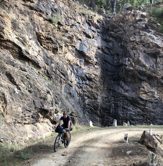 Tientallen haarspeldbochten zorgen ervoor dat we snel hoogte winnen tegen de verschillende bergwanden en inmiddels zijn de hellingen bebost. Aan de bomen is te zien dat hier een paar jaar geleden een bosbrand heeft gewoed, maar de meeste lijken het te hebben overleefd. Ergens rond de tiende haarspeld komen we de eerste en enige levende ziel op dit pad tegen. Het blijkt ook een fietser te zijn, een Oostenrijkse bikepacker.