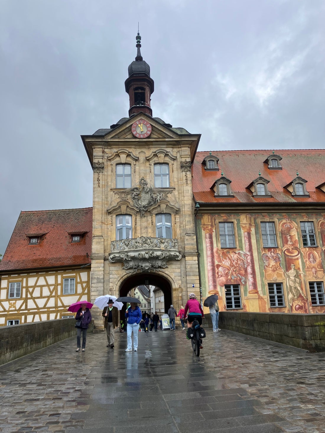 De mensen met tent krijgen op de camping bij Bamberg de leukste doch ietwat ondiepe plekken langs de rivier toegewezen. Uit voorzorg zetten we 's avonds de tarp weer op. Na middernacht begint het weer de hele nacht te regenen en de stortbui in de ochtend staat - terug van weggeweest - ook weer op het programma. Die wachten we af onder de grote overkapping van de camping en doen daarna een rondje door de stad. In de Tweede Wereldoorlog is een relatief klein deel van Bamberg verwoest maar de oude binnenstad gespaard gebleven die nu op de Unesco werelderfgoed lijst staat. Die binnenstad is inderdaad mooi en dat wordt omlijst met toeristen. Zie de foto hieronder met een Nederlander voor de historische romaanse dom. Gekkenhuis!