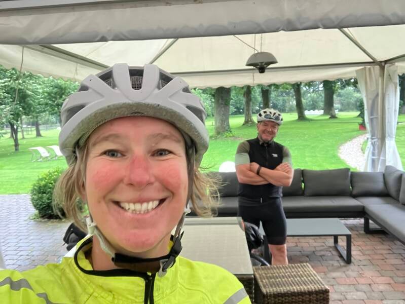 In de ochtend zou het tot acht uur droog blijven. We staan daarom om zeven uur op. Door de harde wind is onze tent best droog geworden, een mooie meevaller. Snel pakken we hem in. De overige fietsers staan later op en hebben minder geluk: het regent alweer. In de keuken-keet wordt het gezellig druk met etende, kokende en schuilende fietsers en er wordt volop gekletst. Rond tien uur is het even droog en springt iedereen snel op de fiets.