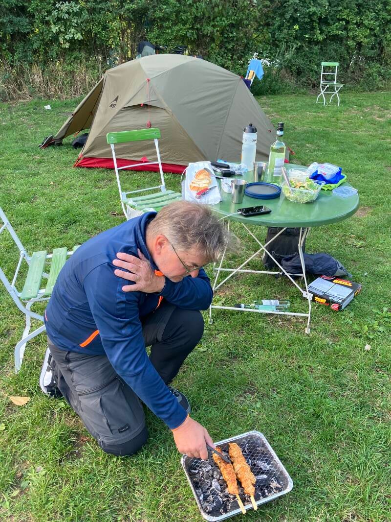 We fietsen door Helmond en in Deurne, na nog geen twintig kilometer, stoppen we al voor een koffie met vlaai en appelgebak. We hebben immers tijd: we hebben een camping in Duitsland in het vizier, op iets van 67 kilometer en de wind blaast lekker in de rug. Op het centrale plein is een event aan de gang waar mensen hun oldtimer parkeren om die te laten bewonderen. De definitie van een oldtimer is hier blijkbaar ruim gelegd, vinden wij, maar het trekt toch best wat volk. We bekijken het tafereeltje maar besteden hier na de koffie verder geen tijd aan en fietsen verder naar Horst, de volgende stop voor een broodje dit keer. In de supermarkt kopen we een banaan, een paar kaiserbroodjes en een doosje Vache qui rit en gaan in de winkelstraat op een bankje zitten. Het is pas half een en we hebben al bijna tweederde van de tocht erop zitten. Harry checkt de camping waar we naar toe willen gaan en komt erachter dat deze alleen dauerstellplatzen in de aanbieding heeft. Niets wijst erop dat wij voor een overnachting met tentje welkom zijn. Harry belt naar de camping maar krijgt geen gehoor. Onze ervaringen met kamperen in Duitsland zijn niet zo positief: allereerst zijn er niet zoveel en de meeste campings richten zich, vaak in een soort vereniging, op langkampeerders die vele jaren een vaste plek bezetten en deze naar eigen wansmaak inrichten en de perceelsgrenzen van schuttingen voorzien. Er is wel meestal plek voor iemand met een camper of caravan, maar voor fietsers die voor één nacht aankloppen wordt geregeld moeilijk gekeken en vaak krijgen we een achterafhoekje op 10 minuten lopen van het sanitair gebouw, aangewezen. Enfin, we gaan met Google Maps op zoek naar een andere camping en inderdaad, er is weinig te vinden, laat staan ene met een tentenveldje of iets dergelijks. Uiteindelijk zien we een camping waarvan verteld wordt dat deze ideaal is voor trekkers. Aandachtspunt is wel dat deze aan de Rijn ligt op nog 60 kilometer fietsen. Direct ruim 100 kilometer op de eerste dag is niet wat wij (en onze billen) voor ogen hebben. Aan de andere kant worden we geholpen door de wind. We hakken de knoop door en laten onze routeapp Komoot een route naar de plek aan de Rijn plannen voor gravelbikes. Tot onze verrassing heeft Komoot er iets moois van gemaakt en fietsen we over leuke paden naar Rijn. Onderweg bellen we toch even naar de camping of we wel welkom zijn vanavond. Dat zijn we, maar check-in is tot uiterlijk 18 uur. Om kwart voor zes staan we in de mini receptie. Het enorme, ietwat rommelige, terrein ligt op de oever van de Rijn en dat betekent dat alle gebouwen en voorzieningen in de winter ergens anders moeten staan en dus klein en mobiel zijn. En zo stroomde ons douchewater niet naar de drain in de douche maar onder de douchedeur naar buiten. Het tentenveld is best ruim en staat gezellig vol met vooral fietsers die de Rijnroute volgen, zonder uitzondering vanuit het zuiden. Er staan ook twee grotere tenten, een met een meneer in rolstoel die de volgende ochtend hulp krijgt van de thuiszorg en een met een meneer die als enige stroomaansluiting heeft voor zijn televisie en radio, die de hele nacht is blijven aanstaan. Deze meneer werkt ergens in de buurt en valt blijkbaar na hard werken 's avonds in slaap bij zijn tv en radio.