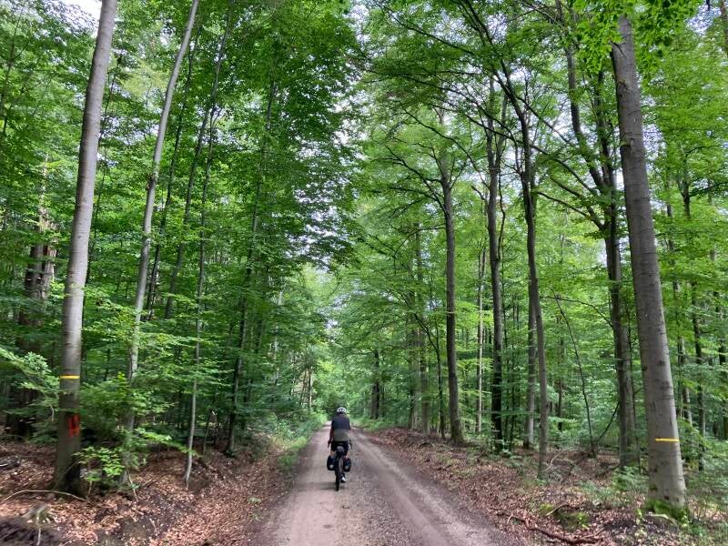 We verwachten de dag erop een wat saaie route en grijpen elke fietsroute aan die de Duitsers voor fietsers hebben bedacht. Het einddoel van de dag is helder: er zijn namelijk weinig campings en daarom willen we naar de enige die enigszins binnen bereik ligt. De pauzes in Lauterbach en Fulda brengen we door bij bakkertjes die vrij goedkope vaak goede koffie mit Kuchen of Brödchen serveren. Aan het eind van middag doemt Monte Kali ook wel Kalimanjaro genoemd voor ons op. Dat is een enorme berg zout uit de mijnindustrie en er groeit natuurlijk niets op en is daarom een dissonant in verder o zo groene landschappen met dank aan de recente overvloedige regen. Monte Kali laten we rechts aan ons voorbij gaan en we gaan zelf linksaf de heuvel op en het bos in.