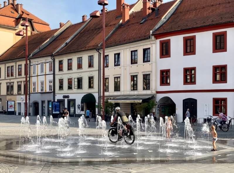 Wat volgt zijn meteen een paar pittige beklimmingen in de hitte van de middagzon, voordat we Maribor bereiken, de tweede stad van Slovenië. De stad heeft een mooie binnenstad met een gigantisch, versteend plein met weinig groen. De hittestess wordt hier tevergeefs bestreden door een geinige fontein waar kinderen doorheen kunnen rennen in afwachting van de onvoorspelbare kracht van de tientallen waterstralen. Ook Harry vindt dat hij en zijn Kona wel wat verkoeling kunnen gebruiken en fietst een aantal malen kriskras door de fontein: de koude douche van onderen was zeer welkom!