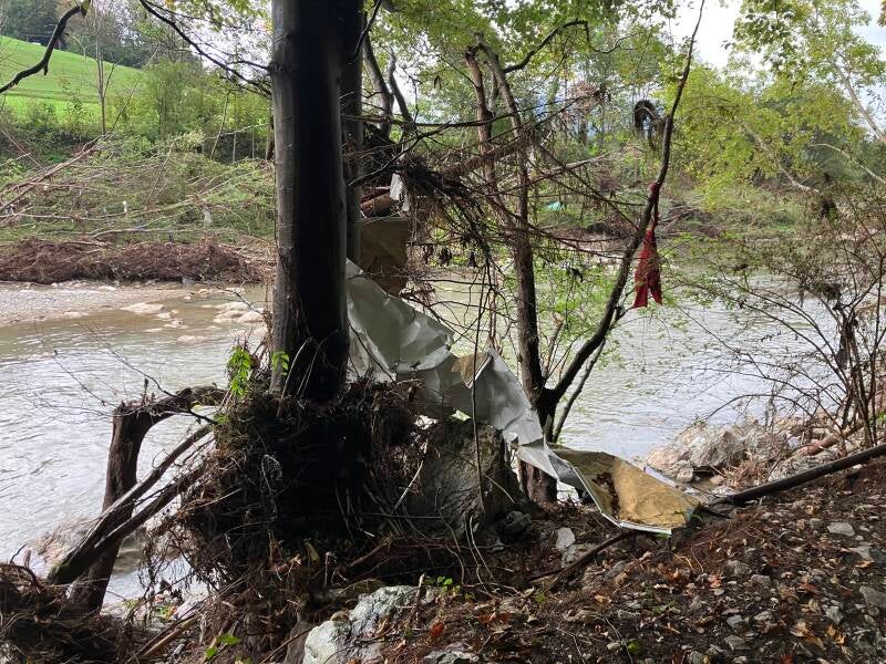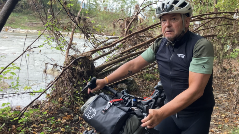 Vertrokken in de regen en geëindigd in de regen. De laatste tien kilometers fietsen we over een bospad. Er is geen dijk meer; de rivier stroomt hier door een kloof. Tot ver boven onze hoofden zien we nog vuil, takken en plastic in de boomkruinen hangen. Naast en voor ons liggen de grotere brokstukken zoals stukken caravan en ontwortelde en afgeknapte bomen. Het voelt best wel vreemd om hier te fietsen.