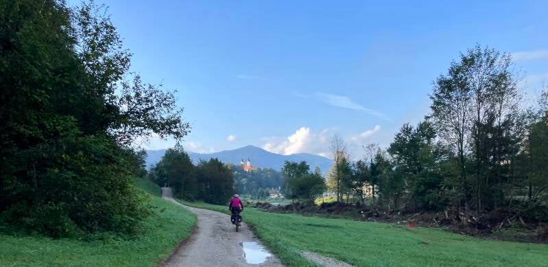 We fietsen verder het dal van de rivier Savinja in en zien al snel de enorme verwoesting die deze rivier begin augustus teweeg heeft gebracht tijdens de overstromingen. Het water heeft tijdens die ramp iets van 8 meter hoger gestaan en, hoewel de rivier weer tot normale proporties terug is, is de vernietiging op de oevers en ver daarbuiten is nog goed zichtbaar.