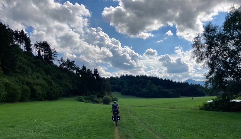 De volgende dag stappen we in dikke mist en dientengevolge wederom met een zeiknatte tent op onze fietsen in de richting van Ljubljana. Al snel breekt de zon erdoorheen.