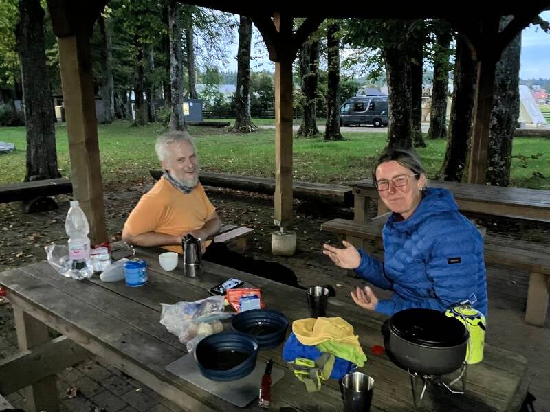Vlak buiten het centrum ligt een camping die achteraf wellicht de mooiste en mogelijk ook nog eens de goedkoopste (of beter: minst dure) van Slovenië zou kunnen zijn. We worden eerst verwezen naar een tentenveldje waar de leukste plekken aan de rand al bezet zijn. Bovenop het terras is daarentegen nog volop ruimte en Harry vraagt of we daar ook mogen staan. Het is al vrij laat en de manager vindt het prima. We zoeken een geweldige plek uit met stroom om onze telefoons en powerbank op te laden en spannen een waslijn tussen boom en “onze” picknick tafel. Later arriveren overigens nog meerdere auto’s en een motor die hun tentje in de schemering en donker opzetten, maar dan zitten wij al in de gezellige overdekte en verlichte gezamenlijke ruimte ons potje te koken. Het wordt steeds vroeger donker (de zon gaat al even na 19 uur onder) en met hoofdlampjes koken doen we niet graag. Één (Duits) fietskoppel zit daar ook en zij fietsen morgen Slovenië uit. We krijgen wat informatie over hun afgelegde route door Slovenië en een tip voor een bepaalde camping (“nog leuker dan deze”) aan de rand van hoofdstad Ljubljana.