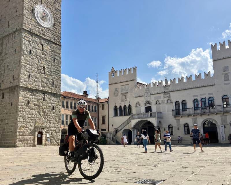 Viel dat even flink tegen. Wat niet helpt is dat Harry de ketting niet meer om het grootste blad (de laagste versnelling) kreeg en uiteindelijk de fiets noodgedwongen moet duwen. Pffff dat wordt wat op de tweede klim naar het middeleeuwse stadje Stanjel die er qua profiel steiler uitziet. En als je het ergste vreest dan valt het uiteindelijk mee. We spreken af om aan de voet van de helling met de hand Harry’s ketting op het grootste blad te leggen. Als het moment daar is schakelt Harry terug en … de ketting valt keurig om het grootste blad. Nou ja, op de vorige heuvel wilde het kreng, tientallen gefrustreerde pogingen ten spijt er niet omheen. Maar goed, het wijst allemaal op slijtage en je hoort Harry (nu) niet klagen. De klim naar het dorp op de bergtop valt ook best mee en bezweet zoeken we een koffietentje op dat ons de lekkerste cappuccino voorschotelt tot nu toe op deze tocht. Toch nog die Italiaanse invloed? Wie weet.