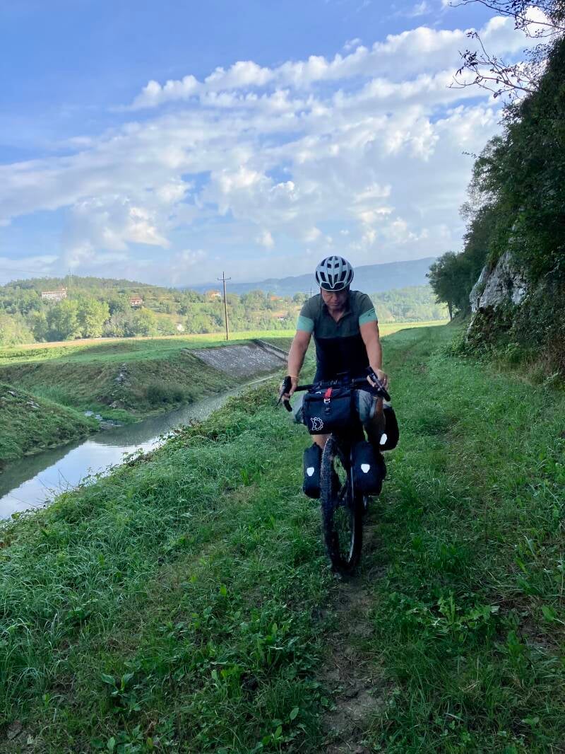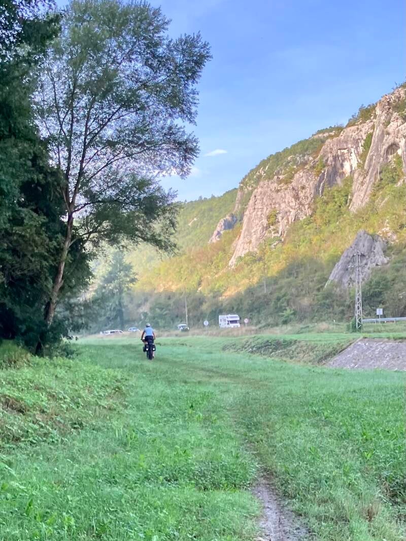 Om vanuit Buzet op die Parenzana te komen heeft Roelie een fietspad langs een riviertje gevonden aan de andere kant dan een provinciale autoweg. Het riviertje dampt in de vroege frisse ochtend, wat een mooi gezicht is, maar het pad is slecht: hoog nat gras met veel onzichtbare hobbels, modderplassen en muggen, dus een ideale cocktail voor een grumpy Harry! Zonder brug zit er niets anders op dan verder ploeteren.
