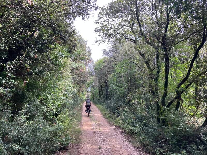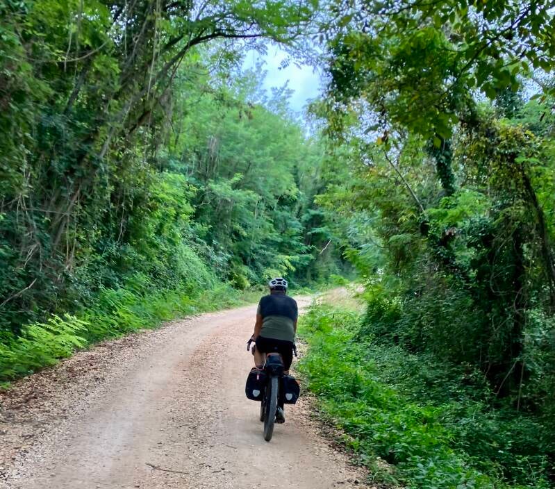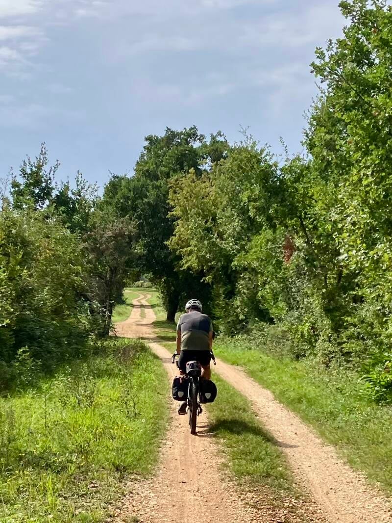 In de afdaling zijn er te veel plassen om te ontwijken (ook een plas van een dame die haar bibshort naar beneden trekt naast het fietspad). Eigenlijk is die Parenzana een hele leuke fietsroute maar ook wel relatief druk. Het gravel is inmiddels verdwenen en heeft plaatsgemaakt voor de rode, vet-lemige aarde die kenmerkend is voor Istrië. De regen zorgt dat de klei weer aan de banden blijft plakken dat, gecombineerd met het grind dat hier daar ligt, zorgt voor opspattend ongemak waar je van alles om de oren vliegt. In dat soort gevallen moet je zorgen dat je vooraan fietst, of dat je op minstens 15 meter afstand volgt.