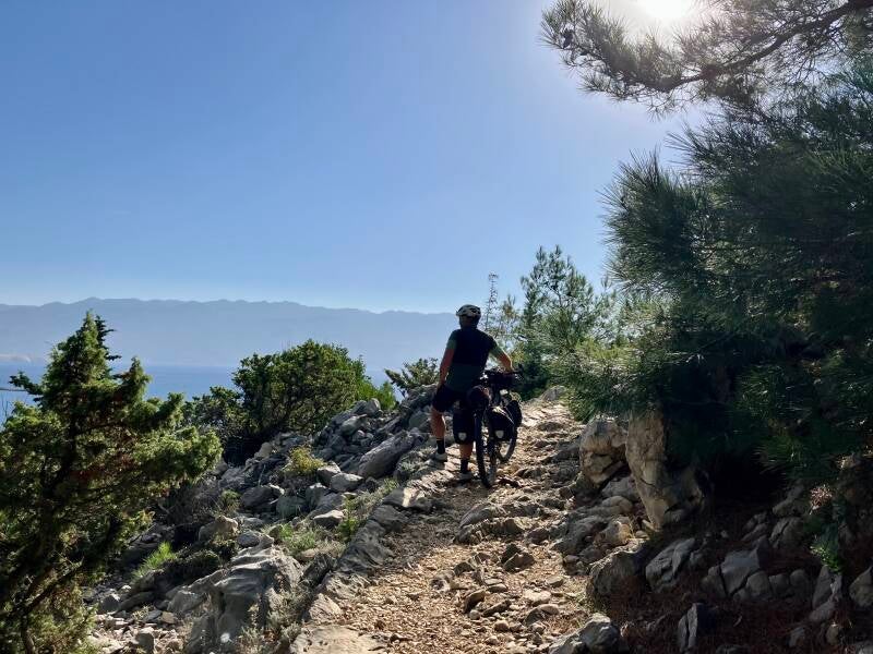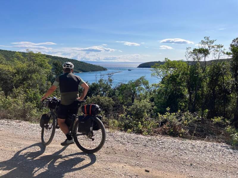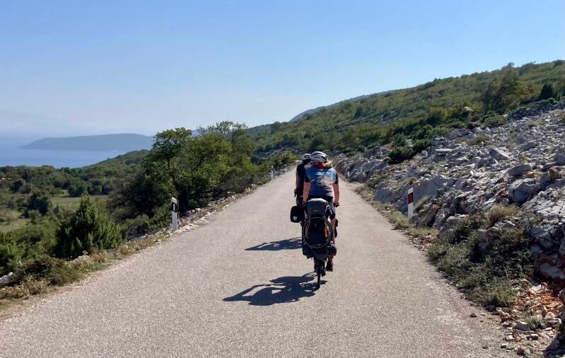 Na aankomst op het eiland drinken we eerst een koffie en laten de auto's de berg op vertrekken. We mogen 10 kilometer klimmen om op 450m hoogte op de top van het eiland te komen. Traile doet geen koffie maar een biertje en gaat als een trein omhoog. Chapeau voor haar, ze is net 60 en echt superfit. Als ook wij eenmaal boven aankomen cruisen we met de wind in de rug naar de volgende veerdienst over de rug van het noordelijk deel van eiland Cres. Op een gegeven moment hebben we vrij zicht naar de oost- en westkant van het eiland. Het zicht is helder en overweldigend.