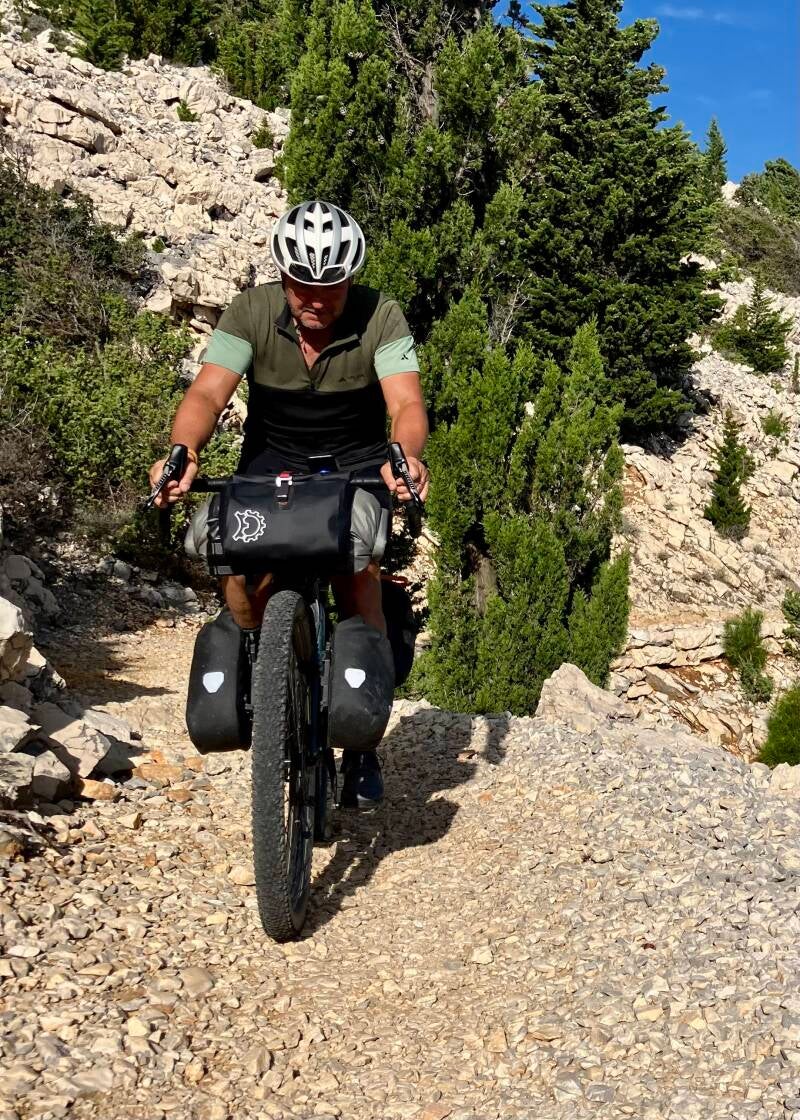 De Brompton is de Ferrari onder de vouwfietsen maar het is geen fiets om mtb of gravel routes mee te doen. We fietsen de volgende dag samen met Traile en ons dagdoel is dezelfde camping Romatik in Labin maar onderweg gaan we van tijd tot tijd andere (gravel)wegen nemen. Via de telefoon kunnen we elkaars locatie zien en weten we wie op wie kan wachten als de wegen elkaar weer vinden.