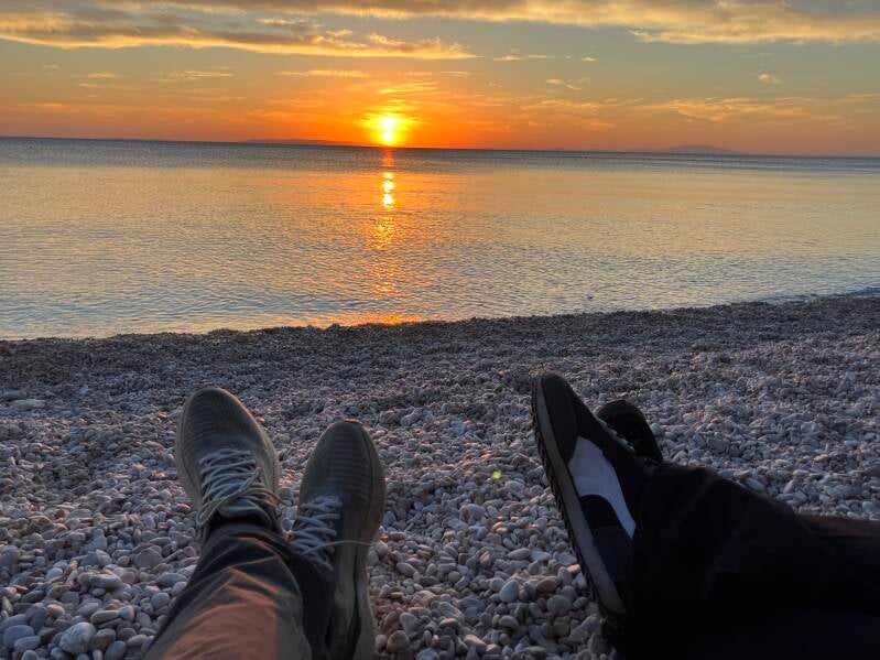 Wij hebben alle tijd en aangezien het vanmorgen pittig was en het vanmiddag best heet is, houden wij het al snel voor gezien en zwaaien af bij een terras in Novalja. De dichtstbijzijnde camping ligt even verderop net na een supermarkt en dat is ideaal. Die camping is echter gigantisch en echt helemaal niet ons ding, maar we hebben de boodschappen op de rug hangen en gaan het gewoon doen. We fietsen al bijna een kilometer langs de camping voordat we bij de entree komen. De portier vindt dat we onze fietsen in het rek moeten zetten (wat helemaal niet past met onze oversized banden) en komt niet erg vriendelijk over. Vervolgens komen we in een ruim kantoorgebouw met verschillende balies terecht. Grootschaligheid vraagt om structiur en automatisering en dan vervalt (een deel van) de charme. Die charme wordt nog eens extra aangetast als een Oostenrijks stel met hun camper voor onze tent parkeren terwijl er nu in het naseizoen echt heel veel ruimte is en honderden andere plekken te vinden zijn. Maar ja, op dit deel van de camping mag iedereen zelf vrij een plek uitzoeken dus we hebben niets te makken. Elektriciteit is in de overnachtingsprijs inbegrepen maar je raadt het al, daarvoor heb je zo'n dikke campingstekker nodig, die niet tot de basisuitrusting van wereldfietsers behoort. Om de powerbank op te laden moeten we die achterlaten bij de receptie omdat we nare ervaringen hebben met het opladen (dus achterlaten) in een sanitairgebouwe op een megacamping. De koelkast met individuele units, waar we ene van huren, is weer helemaal een paar kilometer de andere kant op. Zucht... Voor de zonsondergang wandelen we naar het kiezelstrand en daar houden we op met zeuren over de camping. De zonsondergang is prachtig en het meegenomen glaasje, gekoelde wijn smaakt heerlijk.