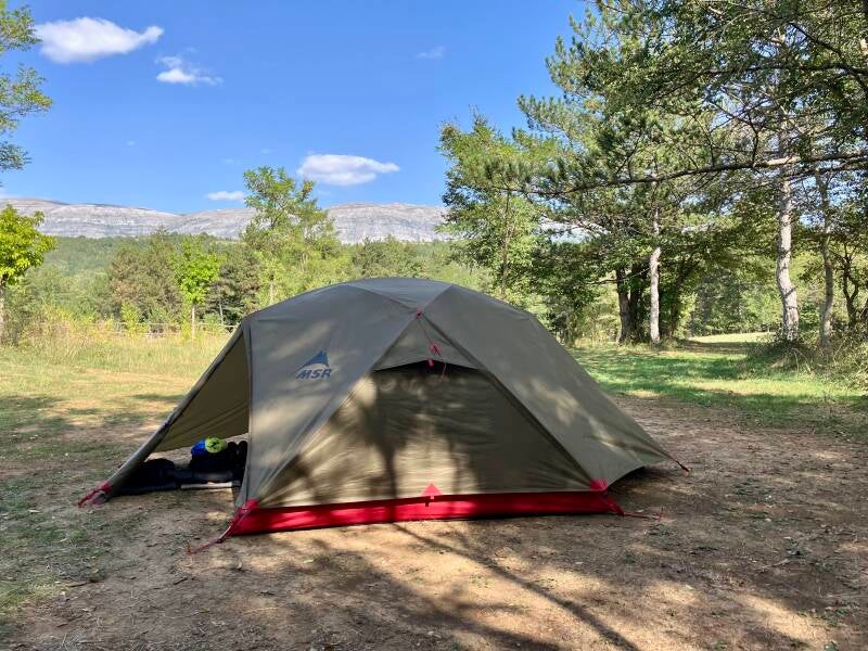Dik na 12 uur bereiken we de top op 870 meter hoogte en de resterende 10 kilometer naar Vrlika overbruggen we in no time. In Vrlika is een of andere processie gecombineerd met een soort van jaarmarkt gaande. In ieder geval krioelt het van de mensen, gezang en varkens aan het spit. Toch/desondanks/daardoor is ons winkeltje, maar eigenlijk alle winkeltjes in het dorp open. De keuze is niet reuze, maar met een ui, ingeblikte champignons, tortellini, room, panchetta en een boel knoflook kom je een heel eind. We fietsen door naar de laatste en tegelijkertijd één van de meest geweldige campings (Camping Peruca) van Kroatië. Het terrein is enorm en er staan hooguit 3 campers. Wij zoeken het mooiste plekje uit en hebben een prachtig uitzicht op de bergkam van de Dinarische Alpen, die de grens vormen tussen Kroatië en Bosnië-Herzegovina. Daar fietsen we morgen overheen en we weten dat we niet de eenvoudigste weg kiezen, maar ook niet de moeilijkste: we zijn eindelijk aanbeland bij de TransBalkanTrail en gaan daar ook direct van afwijken aangezien racers aangeven dat de trail hier nogal zwaar is.
