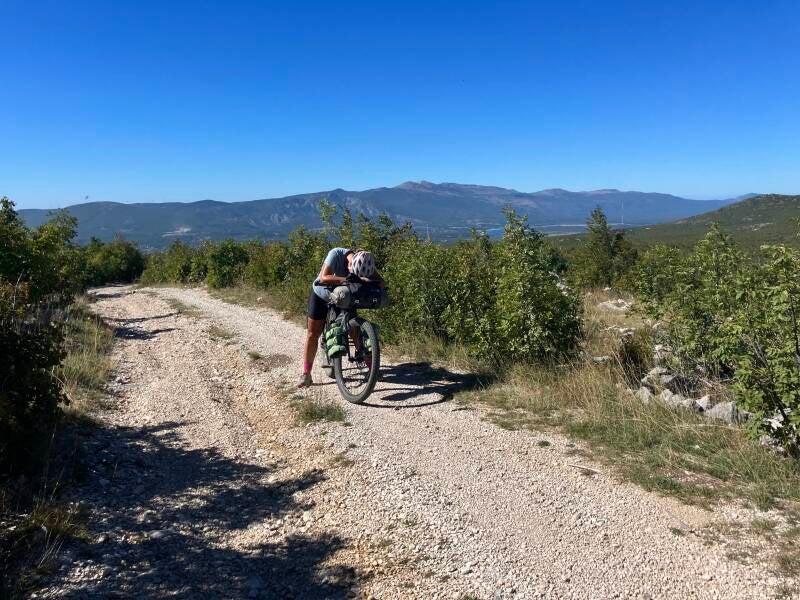 De volgende dag volgen we lange tijd het Peruca meer. Na een kilometer of 25 wordt duidelijk gemaakt dat doorgaand verkeer niet mogelijk is. WTF, dat meen je niet! We keren echt nooit niet terug en fietsen gewoon door. Na geruime tijd passeren we een aantal afzethekken, nog een boel borden en heuse betonnen blokken alsof het de Amerikaanse ambassade in Irak is en komen uiteindelijk in een bouwput terecht… en daar fietsen we ook gewoon doorheen. De wegarbeiders staren ons aan maar niemand houdt ons tegen en na een kilometer of vijf verlaten we opgelucht dit extra moeilijke deel van stof, grind, zand en machines. Even daarna klimmen we in de richting van de Bosnische grens. Het hellingspercentage zit vaak boven de 10%. We verlaten al snel het asfalt en fietsen omhoog op uitdagend gravel waar niemand gebruik van lijkt te maken. Het gravel is diep en zwaar, waarin zich ook geulen hebben gevormd.