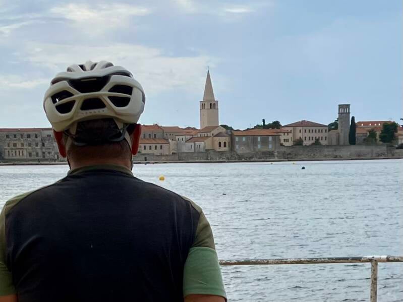 Vanaf Porec volgen we de EuroVelo8 rondom Istrië. Althans dat is het nieuwe plan en op de eerste dag voldoet dat plan prima. Het heeft vannacht waarschijnlijk geregend, in ieder geval drupt het nog wat. We vertrekken pas nadat de laatste buien zijn overgetrokken en de weg weer een klein beetje is opgedroogd. Als we de fietsen van de open binnenplaats halen liggen er twee hopen rode blubber op de sjieke witte stenen van de binnenplaats. ‘Geen zorgen om maken’, 'no stress', zegt de schilder, hij ruimt dat graag later voor ons op en vertelt ondertussen vol passie over schilderen, vissen, een bootrenovatie, de mooie en niet mooie stadjes van Istrië, en haring happen in Volendam. Mooie vent.