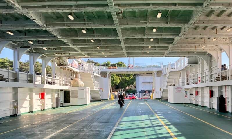 Het is een (veel) kleinere boot dan de vorige veerdiensten en vaart eens per dag heen en terug naar eiland Gap. Er kunnen maximaal 7 fietsen mee die op het voordek worden gezet. De bagage moet er vanaf. Aan boord is een Duitse fietser die gisteren te laat was voor de boot. Hij zit wat krap in de tijd nu om Split te halen en moet misschien een trein nemen. Hij springt snel op z'n fiets en wij volgen even later en krijgen meteen weer zo'n afgrijselijk steile helling voor de kiezen om in no-time weer dik honderd meter hogerop te geraken.