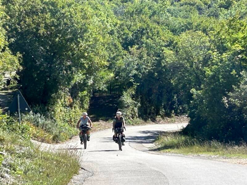 Bij de eerste de beste brug draaien we van het pad af en gaan verder over de provinciale weg waar overigens bijna geen auto op rijdt. Onderaan heuvelstadje Motovun komen we op de Parenzana-route terecht waar een Duits stel bij een bord van de route vertwijfeld staat welke kant ze op moeten. Ze volgen de route al vanaf Triest en gaan dan dus dezelfde kant op als wij. Ze hebben weinig bagage (geen kampeerspullen), fietsen op e-bikes en zijn veel sneller dan wij. Even verder worden we ingehaald door een gids die met een groep van circa 30 grijze e-bikers de heuvel op fietst. Als zij een massale plaspauze stop maken, fietsen wij hen weer voorbij. Daarna krijgen we een korte stortbui op onze donder. We schuilen onder een boom en dat heeft met stortbuien vrij weinig zin. Als de regen na korte tijd door het bladerdak breekt, fietsen we maar verder en raken binnen een minuut compleet doorweekt. Ons motto is bij dat soort situaties dat je toch niet natter dan kletsnat kunt worden.