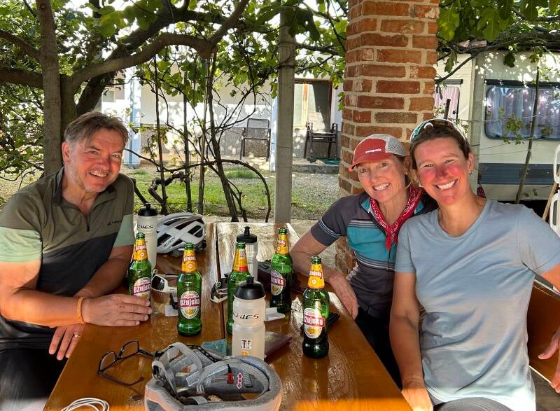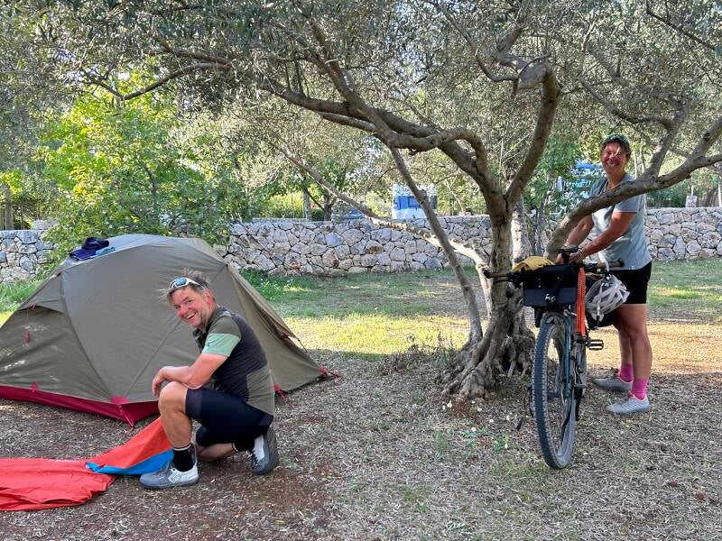 De beoogde kleine camping Piccolo is 'vol', in de zin dat ze in deze laatste week/weken van het seizoen de vrijkomende plekken niet meer vullen. Potverdikkie, dat is nu al de tweede keer achtereen dat we (dreigen) weggestuurd (te) worden. Voor fietsers best een probleem ware het niet dat het hier wemelt van campings. Piccolo verwijst ons naar de megacamping Arena ernaast. Alle drie voelen we er weinig voor, maar we zijn daar wel welkom en krijgen de kans om op de allermooiste plek langs de zee te staan. De wc is een flinke wandeling en voor de koelkast nemen we de fiets. Traile en Roelie treken stoer de bikini aan en springen in de zee en rennen dan heel hard naar de verafgelegen warme douche om weer wat op te warmen. Het is dan trouwens wel eindelijk gestopt met regenen maar uit voorzorg is de tarp opgezet.