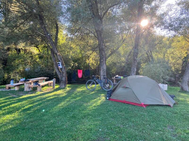 De vlakte van de vallei ligt alweer achter ons als we de laatste kilometers naar de camping fietsen over singletracks, door weilanden, over karrensporen met diepe groeven en pittige hellingen. Harry kan best narrig worden, als hij merkt dat we het ons onnodig (te) moeilijk maken, zeker op het einde van een inspannende dag als vandaag. Eenmaal op de camping is alles weer goed, want eigenaar Bruno heeft een idyllisch plekje langs een riviertje beschikbaar gesteld voor kampeerders. De hele camping is nog in de opbouwfase maar al dik in orde.