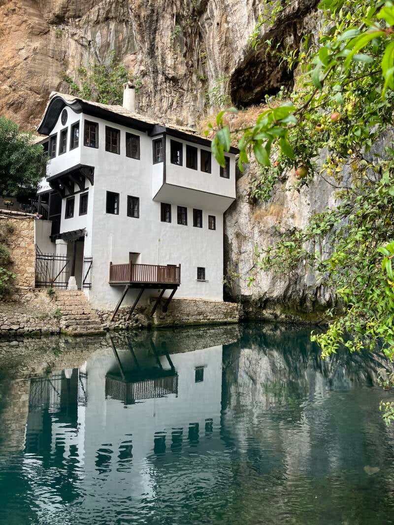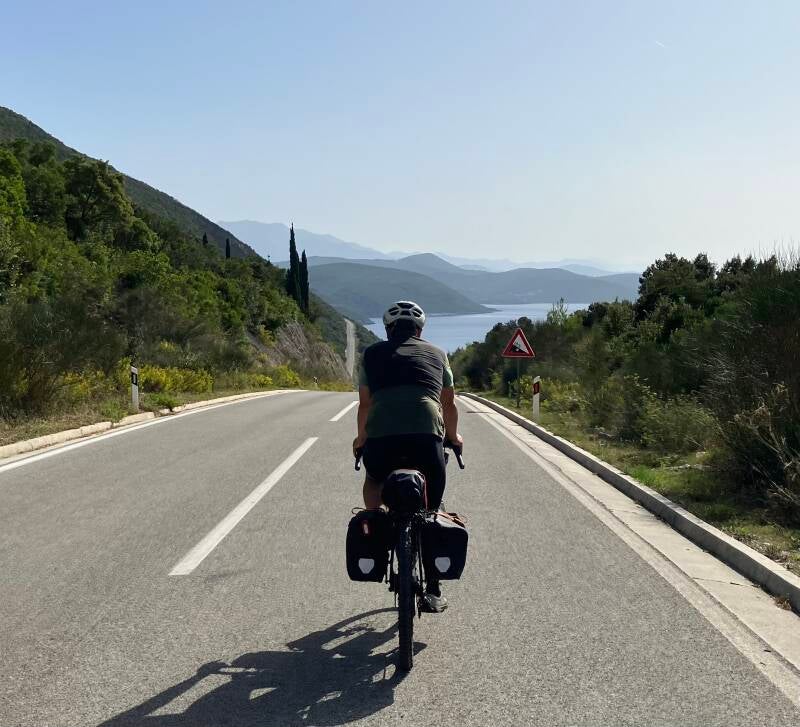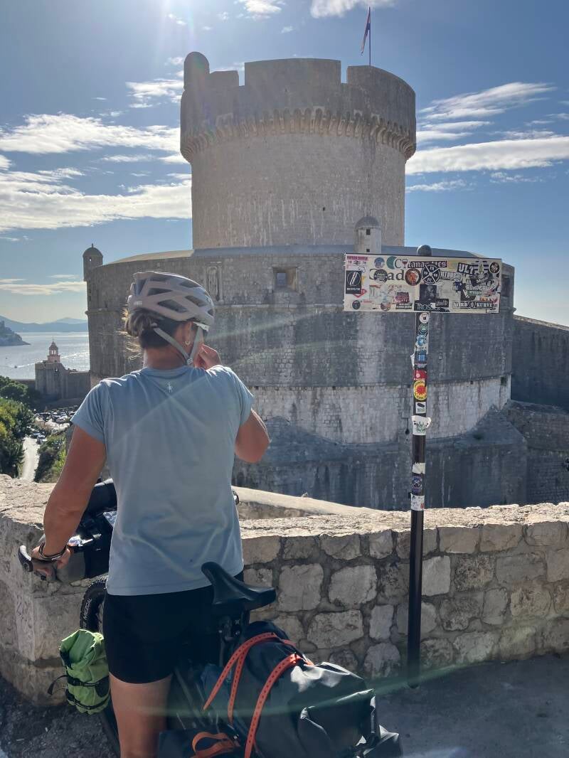 Vanuit Mostar volgen we vervolgens de Ciro Trail naar Dubrovnik; ja inderdaad (even) terug naar Kroatië. De eerste dag is pittig als we een kampeerplek bij een hotel willen bereiken. Van de 150 kilometer tellende route moeten we er dan al meer 90 afleggen. Daarom willen vroeg vertrekken, maar de rustdag heeft ons te relaxed gemaakt en we vertrekken uiteindelijk helemaal niet zo heel erg vroeg. Al snel vinden we de route ook teleurstellend. Via drukke en brede wegen fietsen we Blagaj Tekija binnen, een voormalig klooster bij een bron, nu een museum, met een massa marktkramen, restaurants en busladingen Chinesen die met ons op de foto willen. Dat en de aanwijzingen om de fietsen elders te parkeren waarna er platen tegen de fietsen worden gezet door de soevenierverkopers, is voor Harry voldoende aanleiding om hier zsm weg te willen. Roelie houdt vol en praat wat met de Chinezen en wandelt met ze naar het klooster en bron. Als een tag wordt de foto gemaakt. Been there, het kan van de lijst geschrapt worden, de lijst van toeristische attracties (en die bij ons in de weerzin schieten).