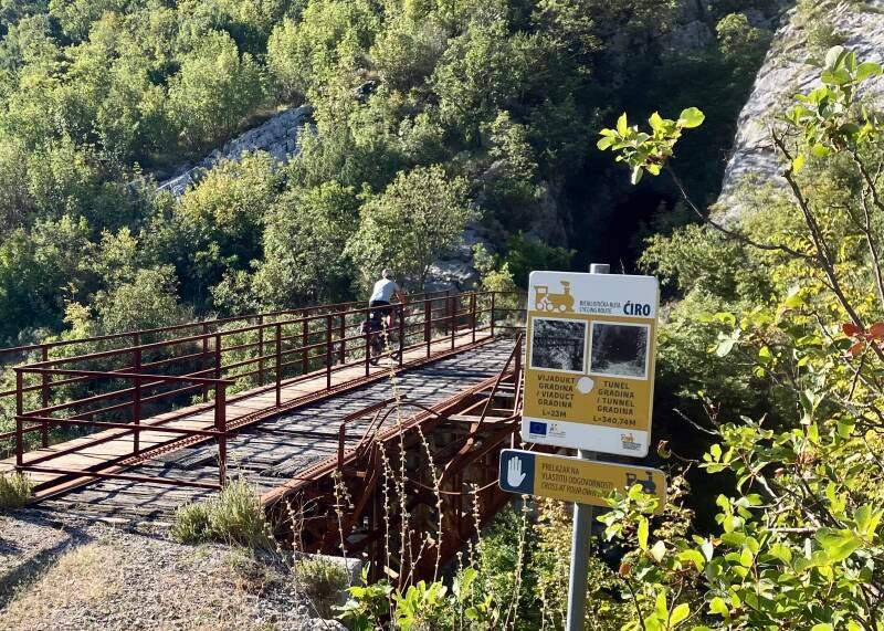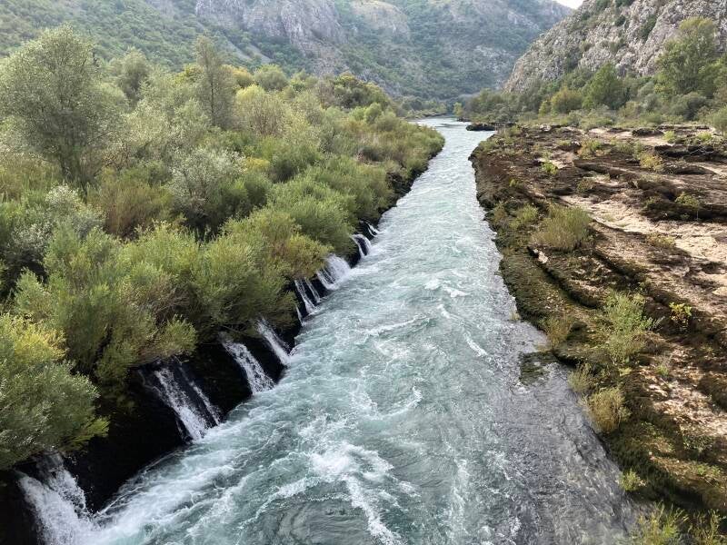 Iets verderop slaan we af van de grotere drukke weg ernaar een brug over de rivier, waar zich een natuurlijk kanaal in heeft gevormd. Het water van de rivier door Mostar komt hier samen met het bronwater van Blagaj en valt over een lange afstand in dat kanaal als brede, korte waterval. Het pad dat we daarna fietsen lijkt ook eindelijk op een voormalig spoorlijntje, wat de Ciro Trail is.