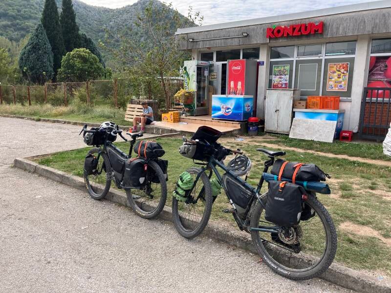 Over geld gesproken, we zijn per ongeluk de laatste pinautomaten in Kroatië voorbij gefietst en zitten wat laag in het contante geld. In Bosnië hebben ze geen euro's maar kan er op de meeste plekken wel mee betaald worden, meestal met wisselkoers 1€=2BAM (Bosnische marken). Die laatste eurootjes willen we graag als backup achter de hand houden, maar bij dit ienemiene minimarktje kan niet met de bankkaart worden betaald. Avondeten, en zelfs het geliefde koude biertje na het opzetten van de tent, laten we achterwege. Een paar kilometer verder dan de camping zou een grote shoppingmall zijn waar we dan vast wel met bankkaart kunnen betalen en wat cash kunnen pinnen, denken we.