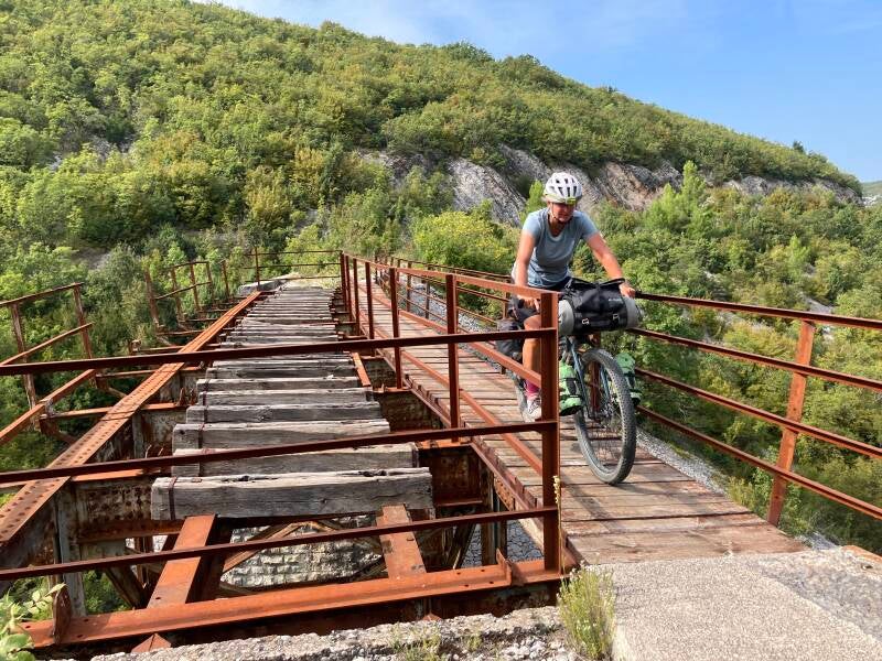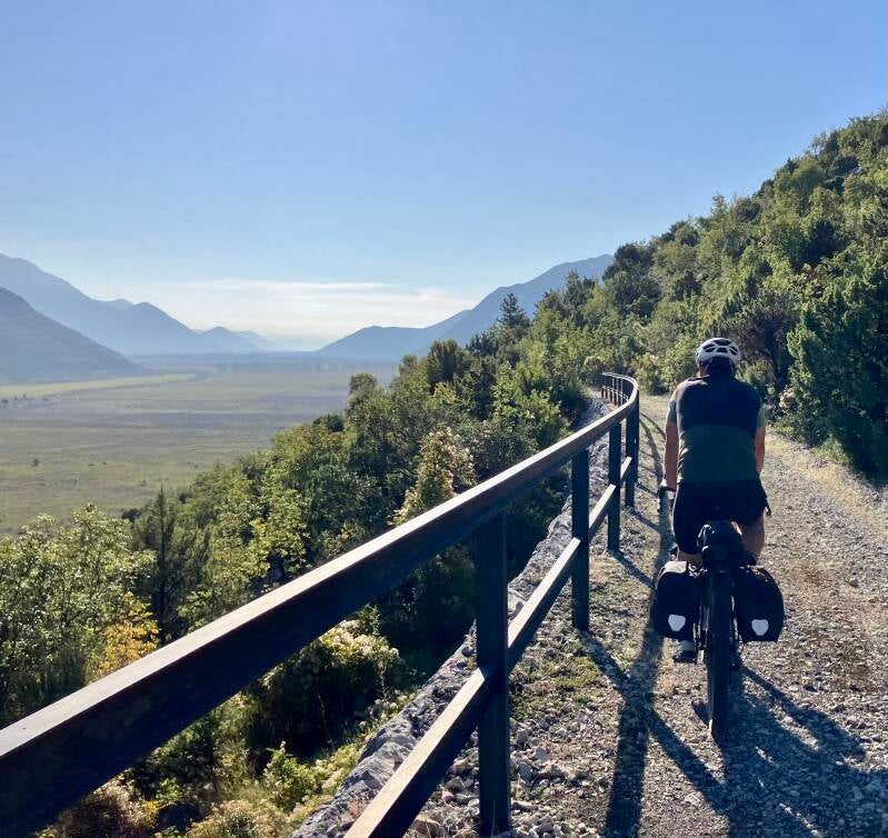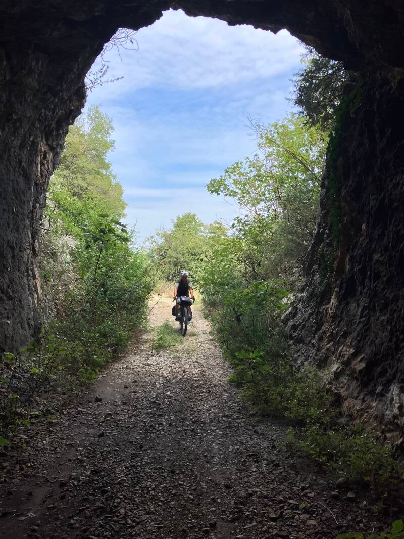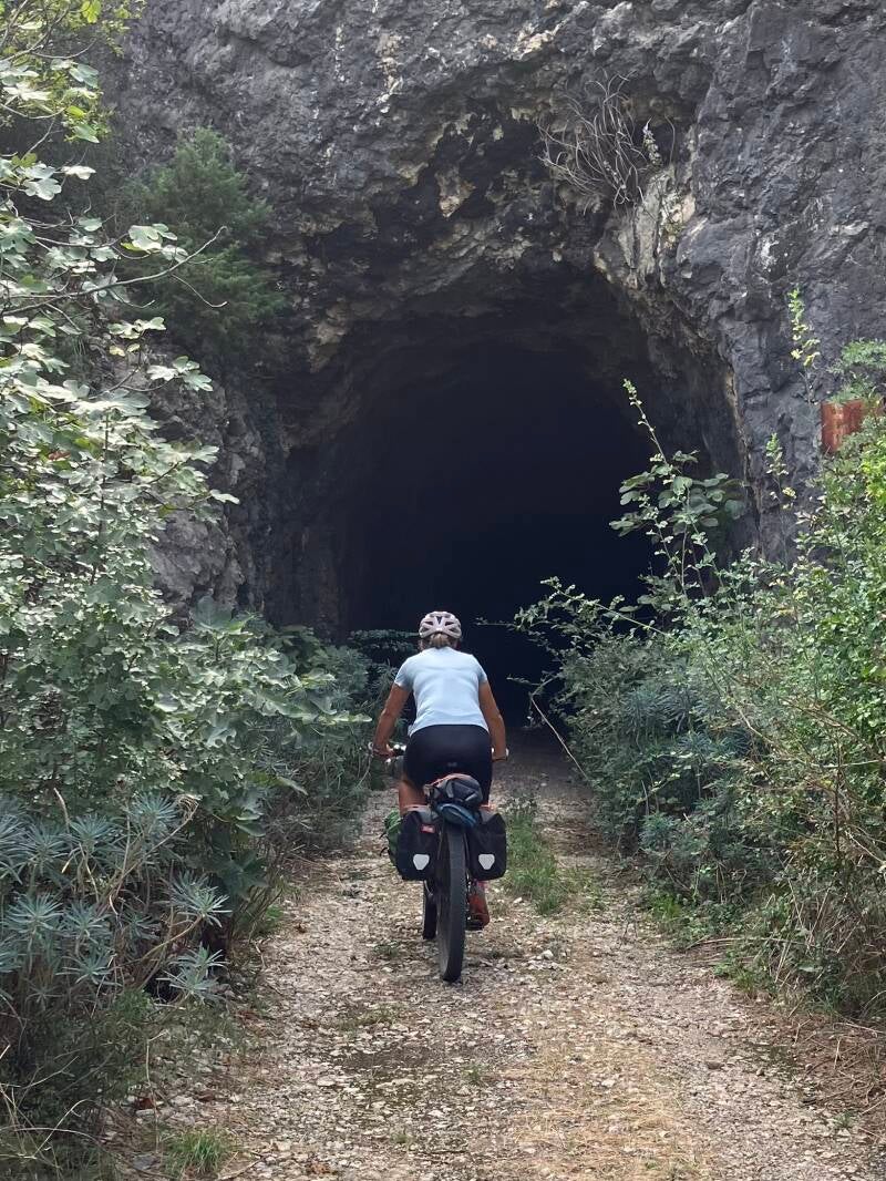 Die bordjes volgen lijkt even moeilijk te worden als er twee richtingen worden aangeven. De ene lijkt de hoofdroute over asfalt en de andere een onverharde alternatief dat, naar later pas blijkt, het oude spoor baantje volgt. De versie over gravel is natuurlijk onze keus, omdat we daar de fietsen voor hebben. Het pad zelf is bij tijd en wijlen niet zo heel makkelijk: het grint is grof, de natuur is hard bezig om het pad terug te claimen en overwoekerd het aan beide kanten met doornstruiken waardoor we stoere krassen op schenen en armen oplopen. En dan de tunnels...
