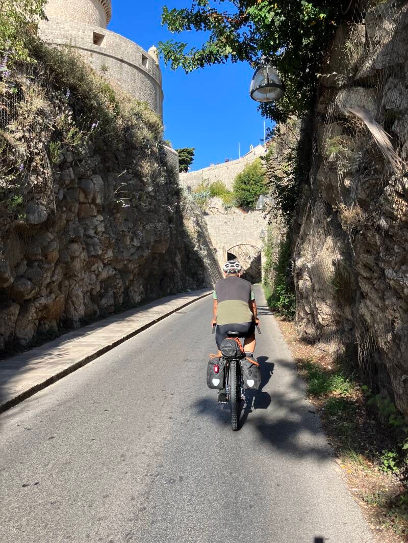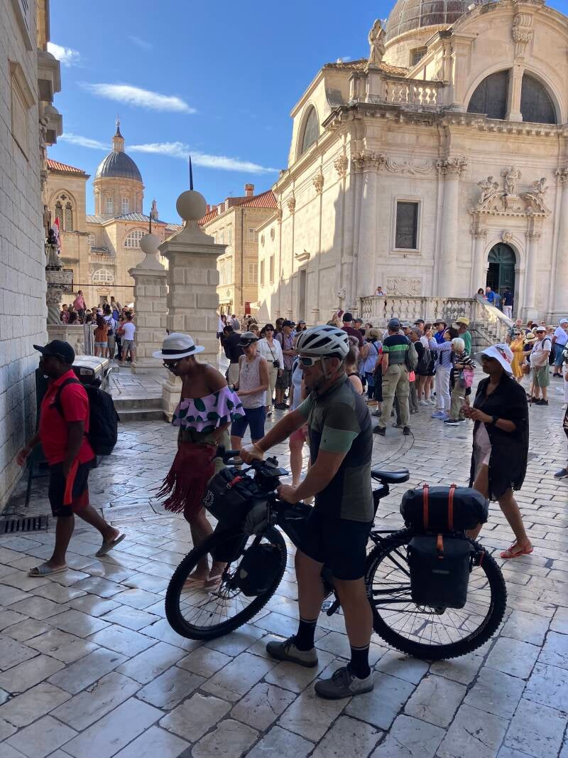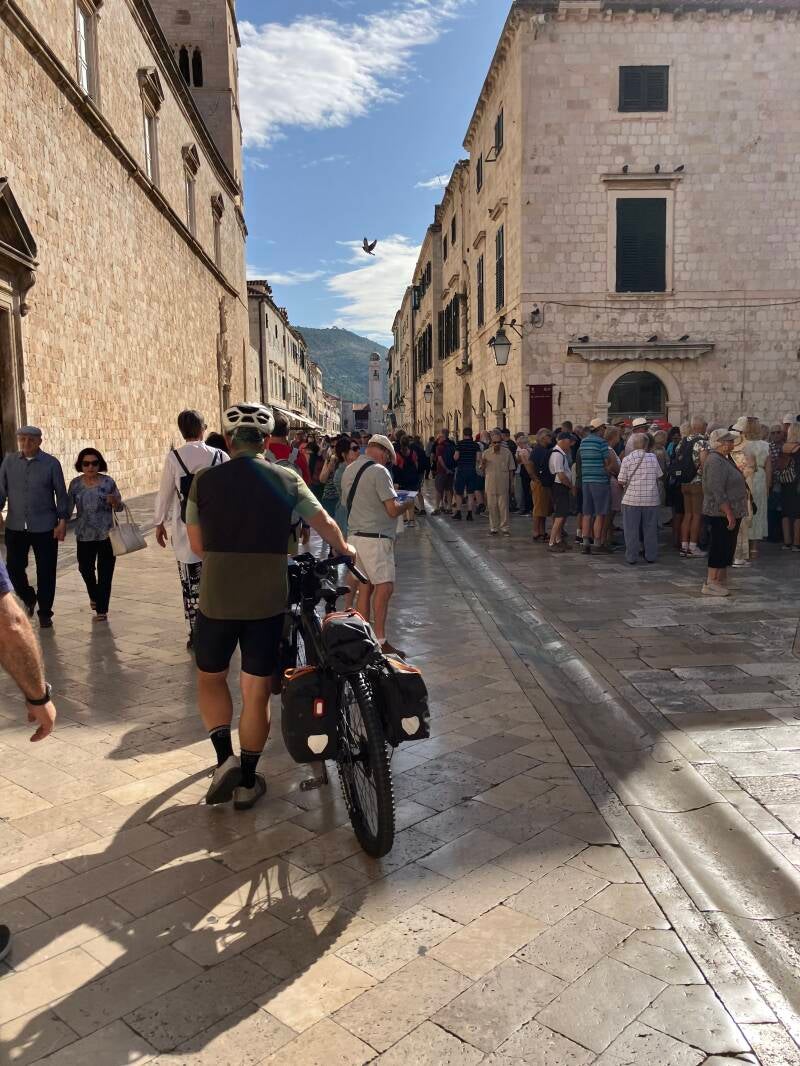 Pronkend met de fietsen toeren we door het oude deel van Dubrovnik voor zover dat met de fiets gaat. De rondgang over de muur gaat niet en binnen de muren is alleen de hoofdstraat te doen. We mengen ons tussen de groepen toeristen en de mensen met rolkoffers. Onze fiets is eigenlijk ook een soort rolkoffer, mocht iemand moeilijk doen over dat we hier met de fiets wandelen. Een gids achter ons heeft het over Disneyland wat de associatie, dat we in een themapark zijn beland, verder aanwakkert. Het is echt een hele bijzondere stad met hoogoplopende smalle steegjes vanuit die hoofdstraat en de gebouwen en bestrating zijn werkelijk oogstrelend. Of er daadwerkelijk nog iemand woont, valt te betwijfelen. Overal zijn horecagelegenheden en souvenierwinkels. Ook zien en horen we om ons heen dat de stad bij de opnames van Game of Thrones is gebruikt als Kings Landing. We houden het bezoek kort.