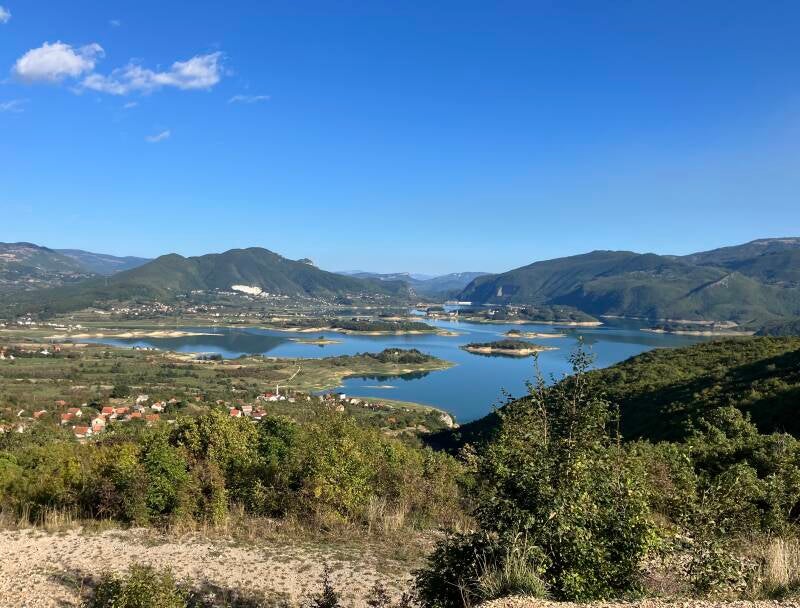 We fietsen na een klim opnieuw over een hoogvlakte en deze keer op een brede hele rustige asfaltweg en dalen uiteindelijk flink af naar het blauwe meer Ramsko Jezero. Na enkel laatste ultieme steile hellinkjes arriveren we op camping Bosjnak op een schiereiland aan de oever van het meer.