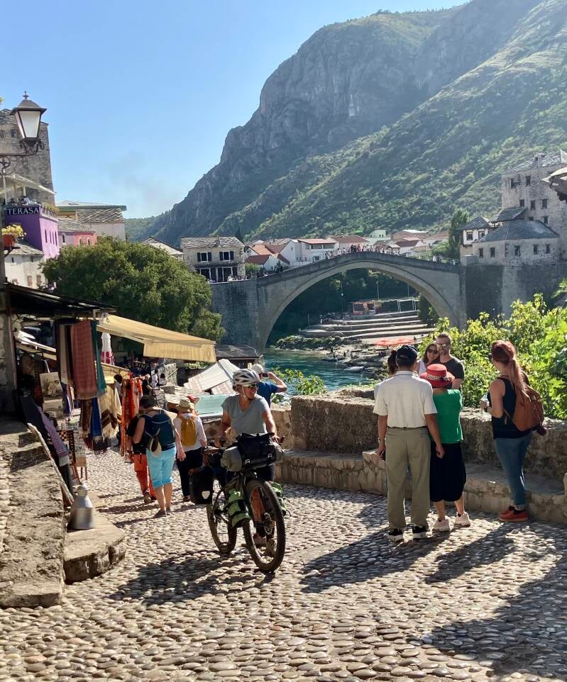 Een paar kilometer voor Moster halen we opgelucht adem als we van de hoofdweg afslaan en via een rustigere weg aan de ander kant van de rivier de stad binnen rijden. Naar later blijkt komen we aan in het Krotische katholieke deel van de stad. De navigatie brengt ons keurig naar DE highlight, waar we niet mogen fietsen: de oude stad rond de nieuwe brug. Het krioelt van de toeristen: busladingen vol cruisevaarders (als uitstapje vanuit Dubrovnik), plus Aziatische-met-de-bus-door-Europa-in-acht-dagen-toertjes, plus van alles en nog wat en dan wij, twee bepakte fietsers uit Nederland, die proberen zich over een brug te begeven. De brug is echt niet geschikt om overheen te fietsen, ook niet om een fiets overheen te duwen tussen zoveel mensen en er zijn hoge richels aangebracht in de gladde geplaveide steentjes. Chaos maar we komen ook hier weer ongeschonden uit en slaan wederom opgelucht adem! Fietsreizigers versus tourists traps: het blijft een moeilijke combinatie.