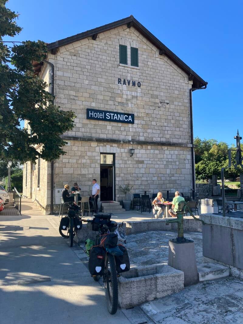 Op enige hoogte passeren we de grens met Kroatië en krijgen we van Bosnië en Herzegovina opnieuw een stempel in het paspoort. Daarna zien we al snel geen bordjes Ciro Trail meer staan en volgen de eerder gedownloade route. Klaarblijkelijk heeft die versie ook hier iets anders verzonnen dan het voormalige treintraject, namelijk een niet zo leuke route over een brede weg met veel verkeer, die uitkomt in het noorden van de stad. Harry rijdt lek en dat kan in principe niet met tubeless, tenzij het gat echt serieus is. Er zit na 2 maanden fietsen vermoedelijk te weinig latex in de voorband om het gaatje te vullen. Er pruttelt nog wel wat en we proberen met steeds weer opnieuw oppompen en stukjes fietsen dat het restje latex het gat dicht. We hebben extra latex bij ons maar niet genoeg als die geheel droog staat. Anyway, we hebben dus latex nodig. Intersport verkoopt er geen en de enige fietsenzaak, die op zaterdag open was, heeft dan net een kwartier eerder de deuren gesloten. We sturen de winkel een e-mail met de vraag of ze latex hebben en sturen meteen ook maar een bericht naar een andere shop die het hele weekend gesloten is. Misschien moeten we wachten tot maandag en een nacht extra in Dubrovnik verblijven maar dan is het fijn om te weten dat we niet voor niets wachten.