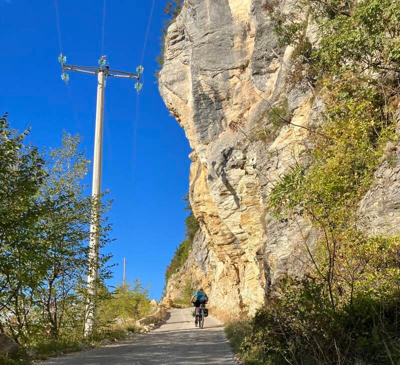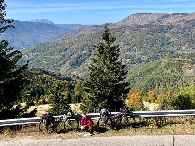 s Avonds zitten we in een hutje aan de oever van het hotel Tara Riverside en puzzelen we op hoe verder. Het idee was om verder landinwaarts via Kosovo naar Noord-Macedonië te fietsen en dan terug naar de kust naar het noorden van Albanië maar het wordt kouder, er komt regen aan en de passen die we over moeten liggen boven de 2000 meter. Dat lijkt ons niet zo slim en dat plan gaat de prullenbak in. We zoeken naar een afkorting en zien een bericht van Julia en Machiel op Polarsteps. We hebben die twee ontmoet op de Ciro Trail en zij zijn via Albanië gefietst en keren terug naar hun camper in Sarajevo. Wat hebben zij voor route gefietst vanuit Albanië? De grap is dat ze een uur eerder een berichtje hebben achtergelaten op onze Polarsteps dat we zeer waarschijnlijk op dit moment (opnieuw) in dezelfde accommodatie verblijven. Als ze dat bericht achterlaten, duiken ze hun bed in. Bijpraten kan morgen en we kunnen op Polarsteps zien dat ze in één dag vanuit Plav zijn komen fietsen. Dat dorpje staat inmiddels bij ons op de planning omdat we daar een vergunning kunnen krijgen voor een grensovergang naar Kosovo en via Kosovo naar Albanië kunnen fietsen. Wij zouden misschien ook in één dag naar Plav kunnen fietsen. We hadden een tweedaagse route op het oog met veel meer hoogtemeters, maar dat hoeft dus niet. De volgende ochtend spreken we Julia en Machiel en ze geven aan dat de route goed te doen is al is het eerste deel niet zo fijn: een drukke weg waarop zij konden afdalen, maar wij zullen gestaag moeten klimmen en er is een stuk van 10 kilometer waar werkzaamheden plaatsvinden. We besluiten het te gaan doen. Acherliggend doel is om vandaag, een vrijdag, dan al de vergunning aan te vragen. We hebben niets kunnen vinden over openingstijden maar achten de kans groter om op vrijdag een geopend loket te vinden dan in het weekend.