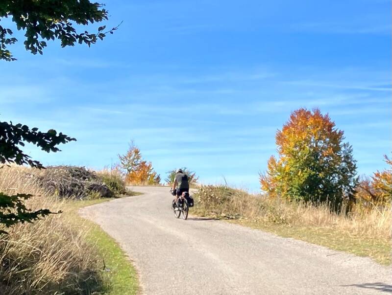 Het wordt best een zware dag met 94 kilometer en 1660 hoogtemeters. Dat stuk over de drukke weg is inderdaad niet heel fijn en we zijn blij als we eraf mogen. Alhoewel, er staat een politiewagen dwars op de afrit. De agent vertelt dat er werkzaamheden zijn en dat er tot 14 uur geen doorgang is. WAT? Nee, daar gaat ons plan. De agent stapt in de wagen en rijdt weg. Dat vinden we wel wat vreemd. Als we twee minuten later waren geweest hadden we gewoon door kunnen fietsen, dus dat doen we ook gewoon maar. Niet veel verder staat een beveiliger. Hij is vrij stellig maar als we hem zeggen dat we naar Plav moeten, gaat de beste man zijn manager bellen. We horen de manager zeggen 'Ne, ne' en zijn even later dan ook zeer verbaasd als de beveiliger terugkoppelt dat er geasfalteerd wordt en dat we doormogen als we langs het vak lopen en niet over het verse asfalt. Jeminee wat een mazzel!!! Gevolg is ook dat we van een drukke weg opeens de weg voor ons alleen hebben, op wat bouw verkeer na. en als we wat hoger op komen zien we prachtige herfstkleuren. Wat de etappe zwaar maakt, is dat van die 94 kilometer eigenlijk alles omhoog gaat, met uitzondering van een 16 kilometer lange afdaling in het midden.
