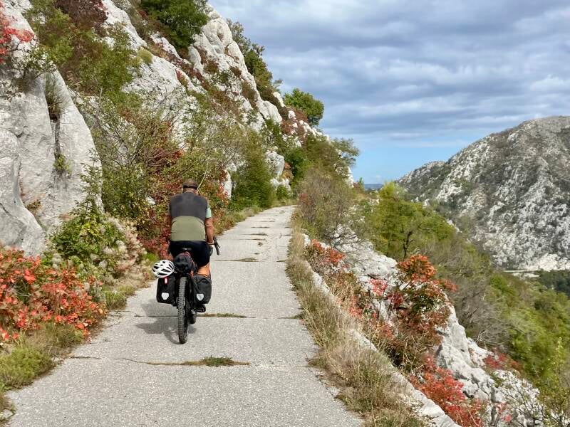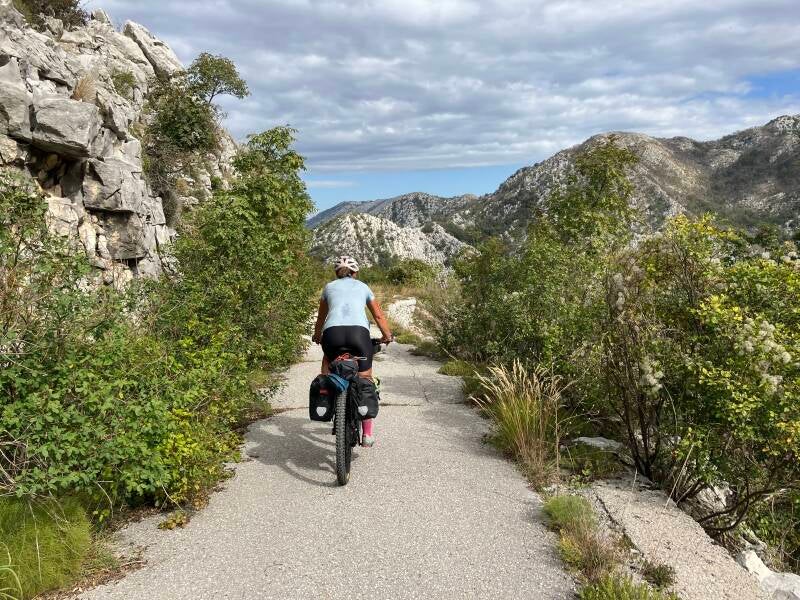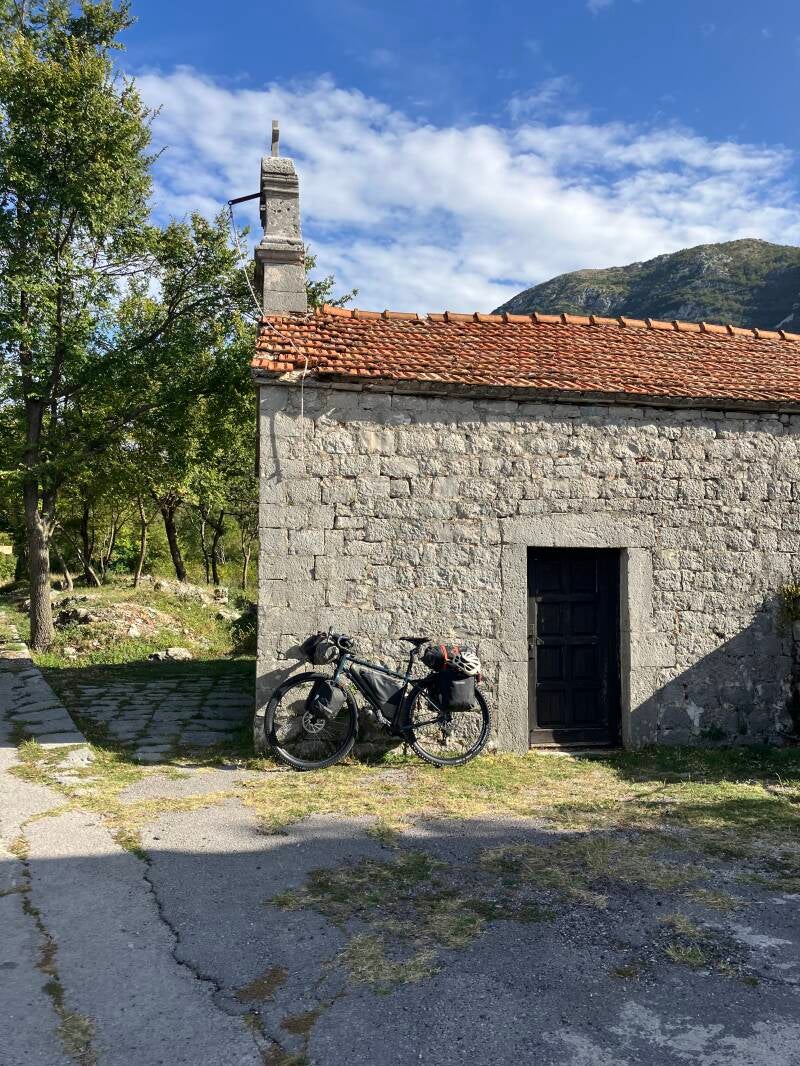 De komende etappes door Montenegro beloven allemaal zeer pittig te worden en die van vandaag is daarop geen uitzondering. We moeten meteen aan de bak en steil de berg omhoog. Gabela, het oudste (of één van-) straatje van Europa is voor ons ook het steilste straatje so far. Fietsend is het niet te doen en duwend, zwoegend en meteen al zwetend zijn we na 500 meter afstand al 100 meter gestegen. Dat betekent een gemiddeld stijgingspercentage van 20%. We zitten al flink in het rood en moeten nog 78,5 kilometer. Eenmaal aangekomen op de "normale" weg krijgen we een prachtige klim met acceptabele percentages, naar bijna 800 m. De weg wordt nagenoeg niet meer gebruikt aangezien er een nieuwe provinciale weg op een andere berghelling is verschenen. We hebben deze berghelling voor onszelf en genieten van de uitzichten. Helaas worden de haarspeldbochten met uitzicht op mooie horizonten, ook gebruikt om afval naar beneden te dumpen. Niet omlaag kijken dus. Boven rusten we uit bij een kerkhof met bijbehorend mini-kerkje en twee gedumpte katjes.