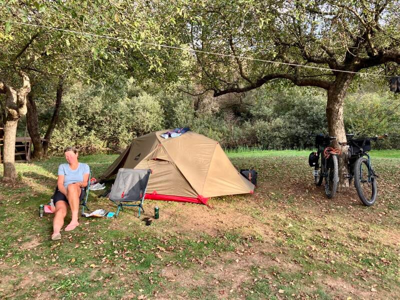 De camping is best leuk en ligt aan een riviertje en naast een restaurant. Naast ons hebben twee Nederlandse gezinnen met twee campers een kwart van de camping tot hun grondgebied verklaard, door hun voertuigen en waslijnen en overige attributen zodanig op te stellen dat er geen doorkomen meer aan is. Ach ja, wij hebben weinig plek nodig en zagen de strategische waslijn niet hangen totdat de vuile onderbroek van een van de koters op onze tent viel. Op één van de campers staat: "we move to grow" en dat is een mooi voornemen. De eigenaar van die camper zien we vervolgens zijn chemisch toilet legen in een van de twee beschikbare toiletten. Het uitspoelen wordt gedaan met tuinslang voor drinkwater... getver daar hebben we net de bidons mee gevuld! Ook zwemt er door de middagactiviteit van het gezin nu een forel rond met voor de rest van zijn leven een dobber in zijn mond. En tenslotte verbruikt de eigenaresse van het move/grow-stel al het warme water door de hele boiler leeg te trekken tijdens een >10 minuten douchesessie omdat madam de cremespoeling nog in d'r haar had. Roelie staat tegelijkertijd onder de enige andere douche en heeft de kraan uitgezet om zich in te zepen. Zij mag zich onder een ijskoude douche afspoelen. Harry wacht nog een uur tot de boiler weer wat lauwwarm water geeft. In onze gedachten wensen we het stel nog veel move en grow toe. Er zit zat ruimte in.
