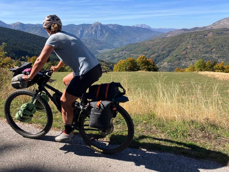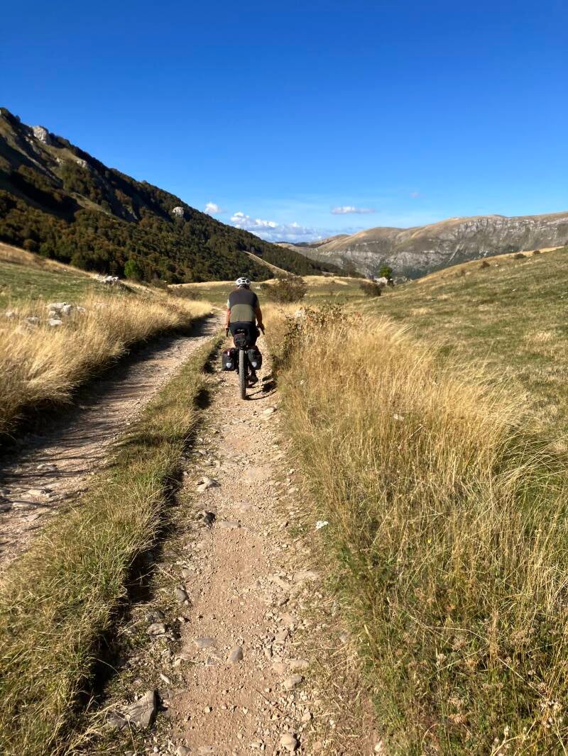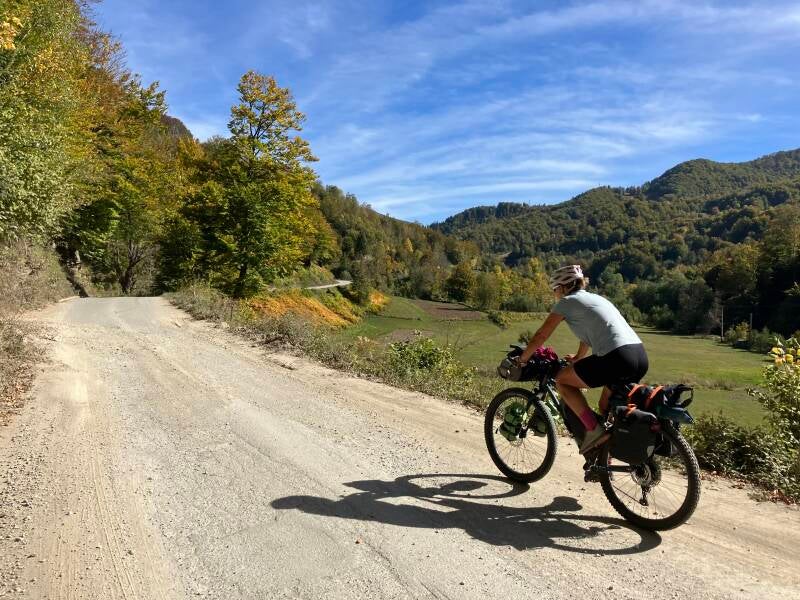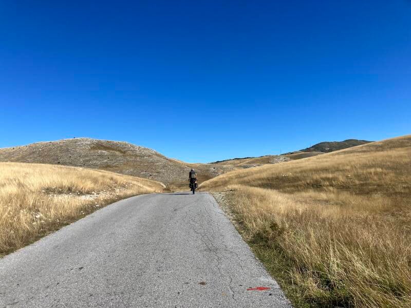 We staan vroeg op, maar vertrekken uiteindelijk toch later dan gehoopt. Er moest nog ontbijt gehaald worden en de tent, die nat was van de dauw, wilden we wat laten drogen. Er staat voor vandaag geen lange etappe te wachten, maar wel ene met flink wat hoogtemeters. De "rakim du jour" (onze zelfbedachte Turks-Franse term voor het hoogste punt van de dag) ligt op 1620 meter. We beginnen daaraan eerst met een tijdje vals plat over een brede, niet drukke weg. Daarna slaan we een landbouwweggetje in en begint het serieuzer te worden. Helaas worden de ups ook afgewisseld door downs, waardoor je voor je gevoel weer opnieuw mag beginnen. Het asfalt wordt belabberder en maakt uiteindelijk plaats voor zwaar, diep, grof grind en stenen, wat de beklimming veel uitdagender maakt en ons af en toe dwingt om af te stappen en "to hike the bike". We komen zeer sporadisch een mini boerderijtje tegen dat in de meeste gevallen verlaten blijkt te zijn. Hier en daar zien we iets dat op enige akkerbouw bewerking lijkt. Hoe hoger we komen hoe meer we alleen zijn met hoe dit gebied er duizenden jaren er ook al uitzag, oké op dat bijna niet te fietsen pad na. Uiteindelijk fietsen we om een bergkam heen en kunnen we een dwarsdal in fietsen. We weten dan al dat dit een pad is voor wandelaars, maar we weten ook dat de helden van de Trans Balkan Race ditzelfde pad omhoog moeten en dat het omhoog niet te fietsen is, zelfs niet voor die minimaal bepakte atleten. Nou, bergaf is het grotendeels ook niet te fietsen. Het is ronduit gevaarlijk. Toch zien we hier en daar wat keuterboerderijtjes. Die mensen moeten nagenoeg in totale afzondering leven. Dat geldt niet voor een kudde schapen, want die worden begeleid of beter bewaakt door twee vervaarlijke uit de kluiten gewassen berghonden met halsbanden waar enorme pinnen uitsteken. Ze rennen woedend op ons af, maar wij weten inmiddels ook hoe we in dit soort situaties moeten handelen (hetgeen geen garantie is op altijd een goede afloop). We vluchten niet maar blijven staan, rapen wat stenen op en verheffen ons stem met Nederlandse verwensingen. De honden binden in en blijven op een paar meter van ons staan, wij blijven ook staan. Al snel is voor beide partijen duidelijk wat de intentie is van de andere partij en kunnen wij door en blijven zij achter.