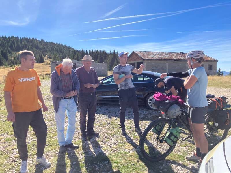 Op de top hebben we rondom een geweldig uitzicht en dat krijgt maar weinig aandacht omdat er vier mannen waarvan eentje beperkt Engels spreekt een praatje aanknopen, chocolaatjes uitdelen, foto’s maken en raki/schnaps schenken. De etnisch Servische mannen komen uit de vallei waar we uit omhoog geklommen zijn en hebben ons ergens een keer ingehaald, als één van de weinige auto’s omdat doorgaans verkeer niet mogelijk is maar een rit naar de top wel. De beperkt Engels sprekende jongeman wijst ons waar Kosovo ligt en wordt door een van de oudere mannen in het Servisch gecorrigeerd. Hij ‘verbetert’ zichzelf snel: “uh Servië bedoel ik”. Ondertussen trekken we meer kleren aan want er staat ons een lange afdaling te wachten en de ervaring leert dat we het dan snel koud kunnen krijgen.